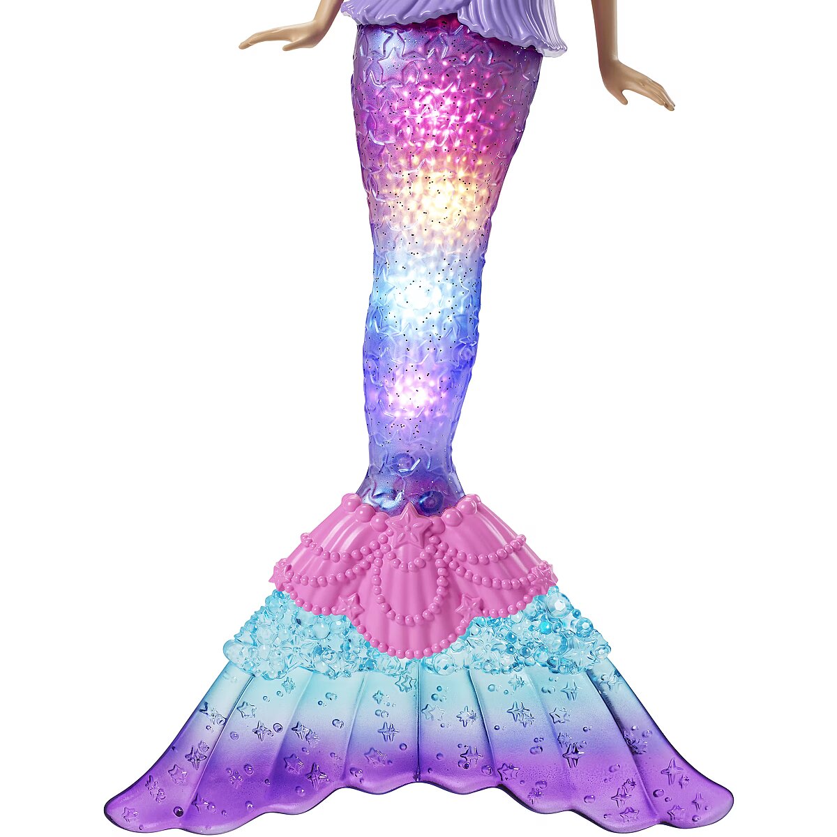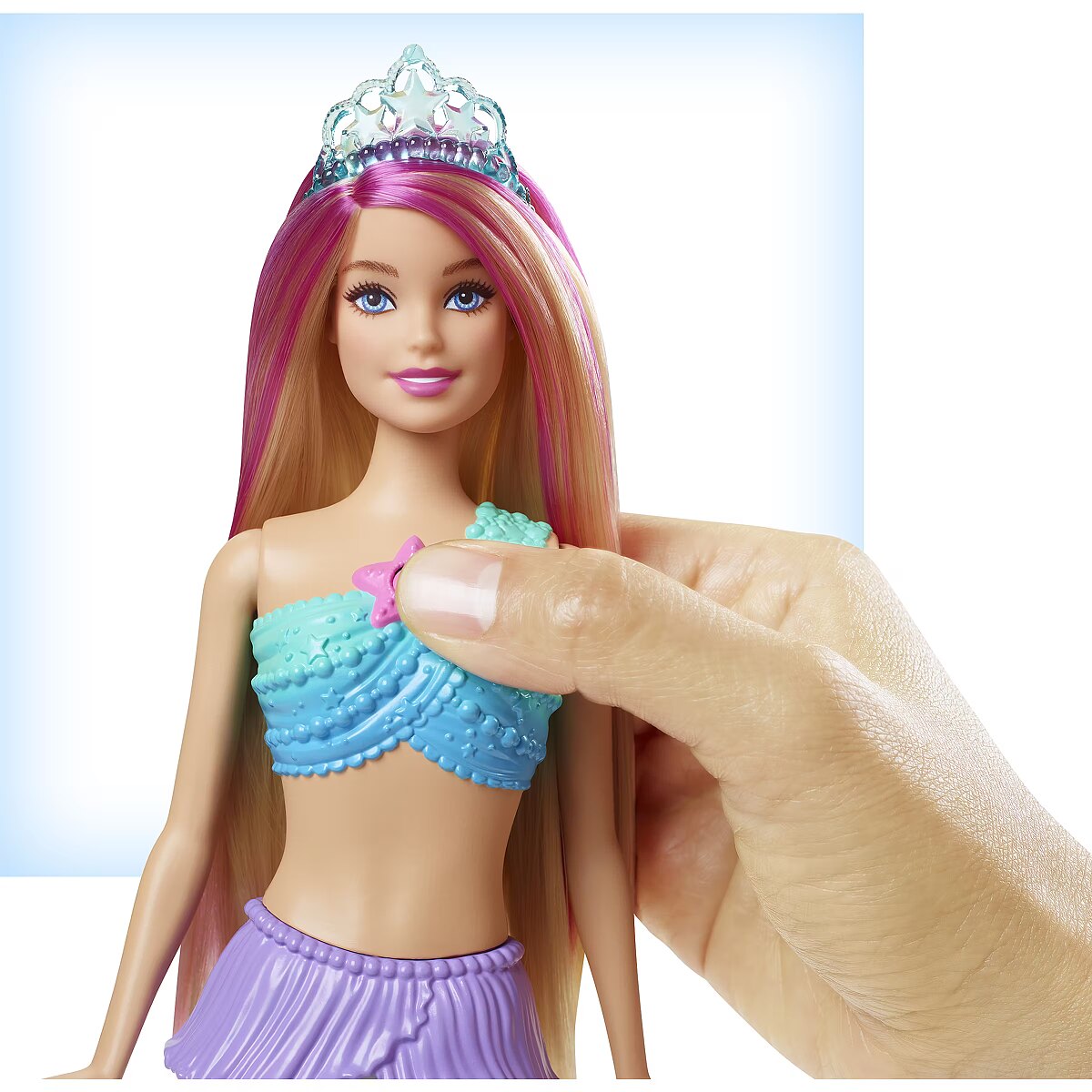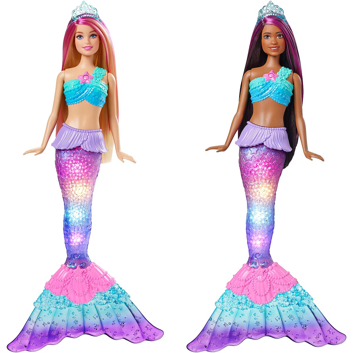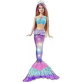 LongDesc - Dive into underwater adventures with the Barbie Dreamtopia Twinkle Lights Mermaid doll! This magical mermaid doll has a light-up feature which kids will love; dip the Barbie doll in water to watch her pearlescent tail light up! Take this beautiful mermaid Barbie dipping in the bath, pool or even the sea! Featuring rainbow fish fins, pink-streaked mermaid hair and a gorgeous princess doll tiara, this Barbie mermaid doll is truly stunning! Makes a great doll for kids aged 3+. Doll cannot stand/swim alone. Colours and decorations may vary.