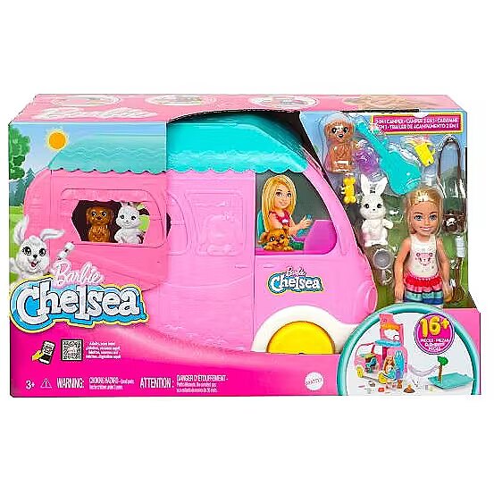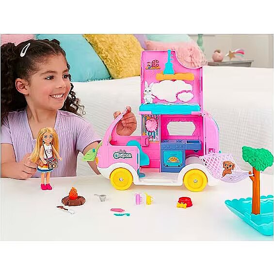 Description - Follow in the footsteps of your imagination with Chelsea doll and her two pets. This camper van is perfect for that! The transforming vehicle when opened reveals six play areas, including the kitchen. Turn the dashboard to make room for eating, and open the roof to reveal a bedroom with beds for Chelsea's doll and her 2 pets, which you'll find included. Turn the roof and fill it with water to make a swimming pool. An additional 14 elements, such as a tree and hammock, inspire you to make up stories by the fire. With so many ways to play, this camper set is the perfect gift for children aged 3 and up, especially outdoor adventure lovers. The doll does not stand on its own. Colours and decorative elements may vary. Take Chelsea doll and her two pets on a campervan trip that transforms into a camping trip. Open the toy vehicle and set up camp: twist the roof, turning it into a swimming pool, then spruce up the camp with a tree and hammock to bask in the sun. Make room to eat on the dashboard and sleep sweetly under the stars in the rooftop bedroom. The 14 accessories add to the camping stories and fuel the imagination. Little Chelsea doll is accompanied on the journey by dog and bunny figures. Expand the play possibilities with accessories such as a campfire and guitar. When it's time to hit the road, just lock up the camper! More adventures await! With so many elements and play possibilities, this Chelsea Camper is a great gift for children over the age of 3 especially for those who love outdoor adventures!