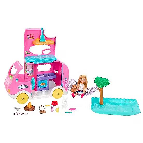 LongDesc - Imaginations can take the open road with Chelsea doll and her two pets with the Barbie Chelsea 2-in-1 Camper playset! The transforming vehicle opens to reveal six play areas, including a kitchen. Flip over the dashboard for a dining space and flip up the roof for a bedroom with beds for Chelsea doll and her two pets, all included! Kids can turn the roof over and fill with water to dive into a pool of storytelling. An additional 14 pieces, like a tree, hammock and more, inspire all kinds of tales by the campfire. With so much fun packed in, the versatile camper makes a great gift for kids 3 years and older, especially those who love adventure and the outdoors. Doll cannot stand alone. Colours and decorations may vary.
