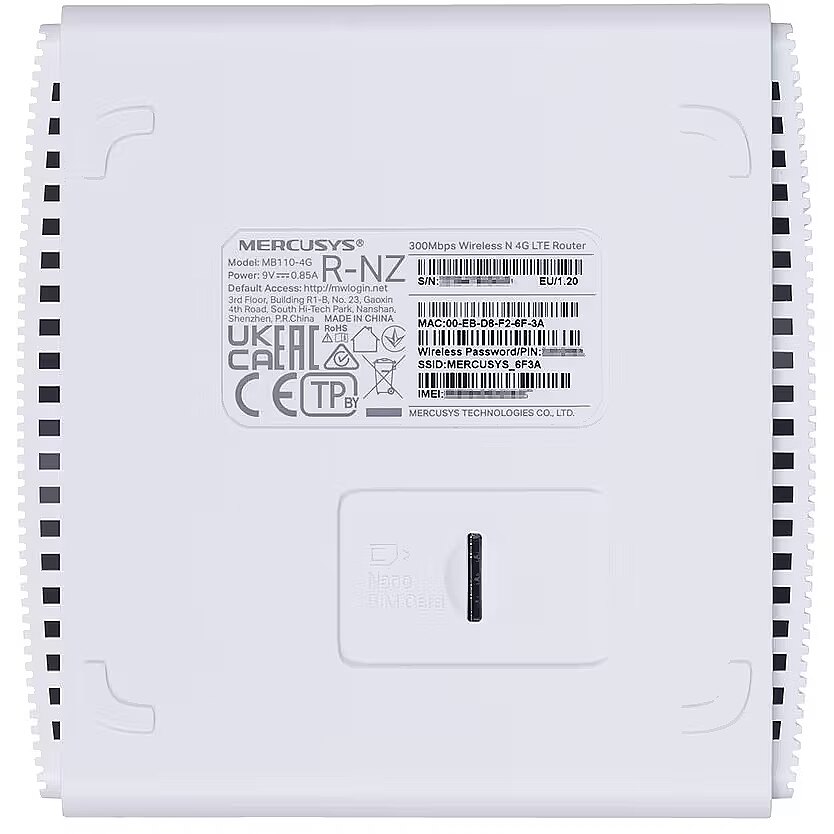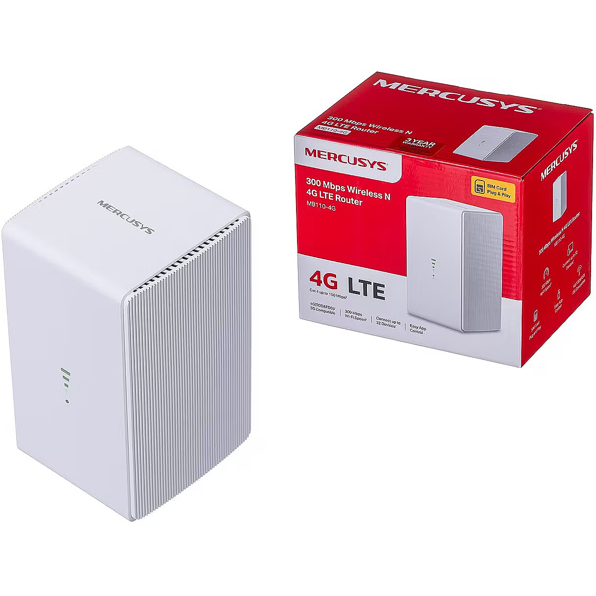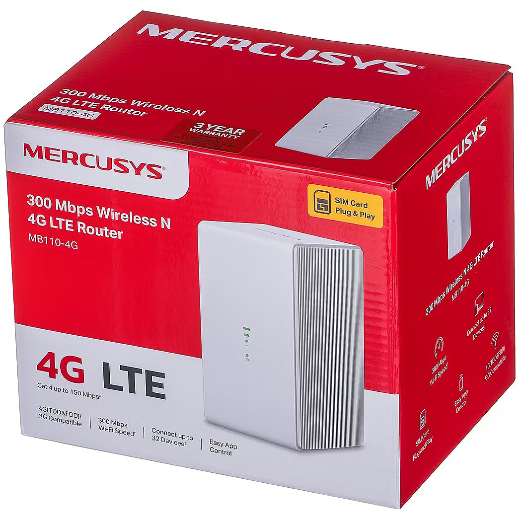 Apraksts - MERCUSYS MB110-4G 300 Mbps Wireless N 4G LTE maršrutētājs 4G tīkls - Koplietojiet interneta piekļuvi ar līdz pat 32 Wi-Fi ierīcēm un izbaudiet lejupielādes ātrumu līdz 150 Mbps Pievienojiet SIM karti un izmantojiet - Konfigurēšana nav nepieciešama, SIM karšu saderība ir nodrošināta ar gadiem ilgušiem testiem 300 Mbps WiFi - Ātrs WiFi ātrums līdz 300 Mbps, lai koplietotu jūsu tīklu Wi-Fi maršrutētāja režīms - Pievienojiet Ethernet kabeli LAN/WAN pieslēgvietā elastīgai piekļuvei, ja nevarat piekļūt 4G savienojumam.
