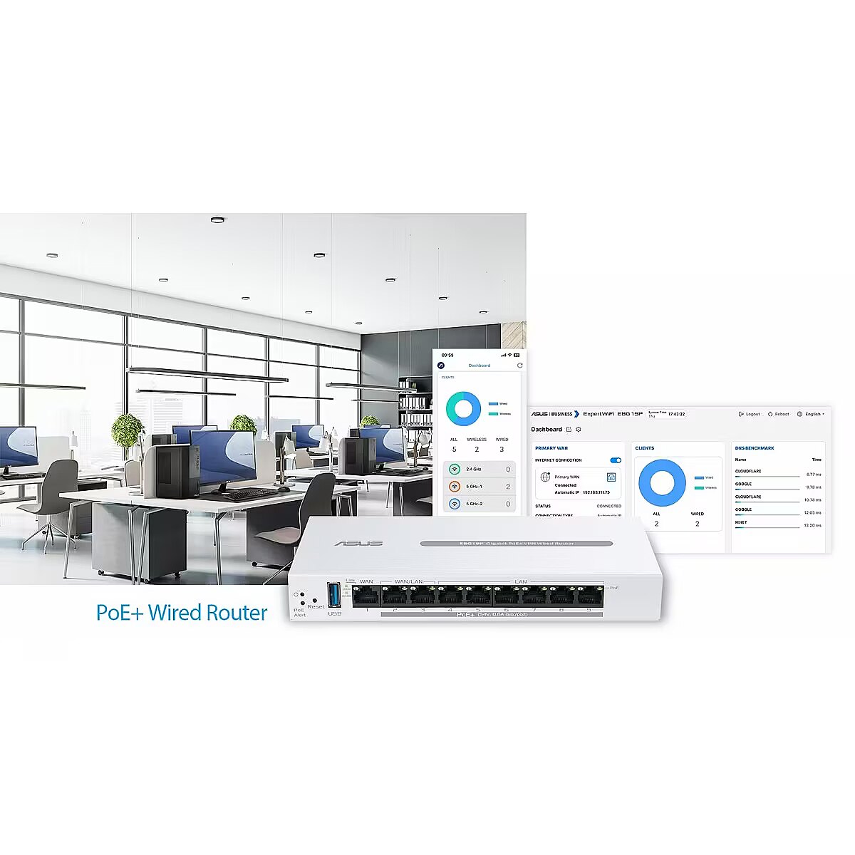 LongDesc - ASUS ExpertWiFi EBG19P Gigabit PoE+ VPN Wired RouterYour Business Network Expert Within ReachThe ASUS ExpertWiFi EBG19P provides a fast, secure and scalable network with rich features tailored for small-to-midsized businesses. EBG19P enhances network stability through Ethernet connectivity and provides internet backup with two WAN/LAN ports and one USB port to support business operations. As businesses expand, owners can connect the EBG19P to the access point for broader coverage, ensuring the scalability and extendability of ExpertWiFi.Fast, Versatile Connectivity to Accommodate the Business ScenariosFor a larger or multi-story space, you can build a strong and stable network by connecting the EBG19P gigabit PoE+ VPN wired router to five EBA63 PoE access points. If you require additional network coverage, you can easily add more EBA63 units to your existing business network.