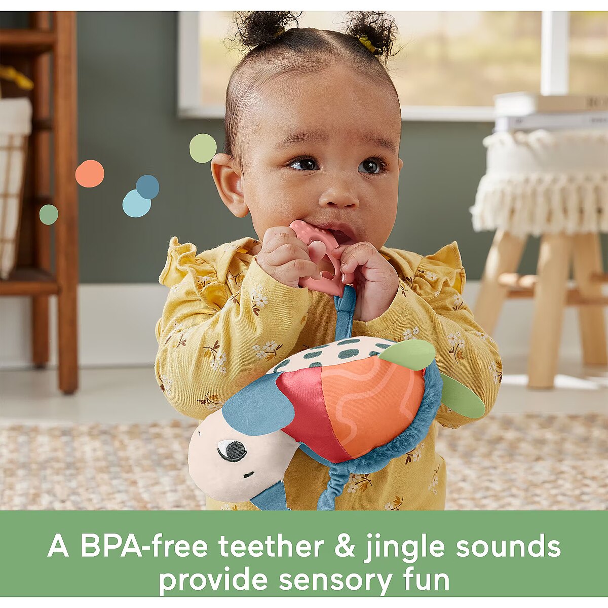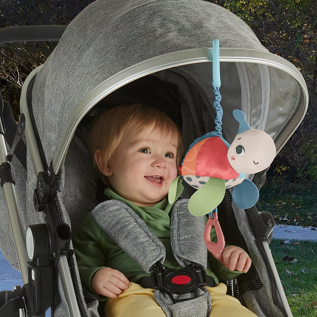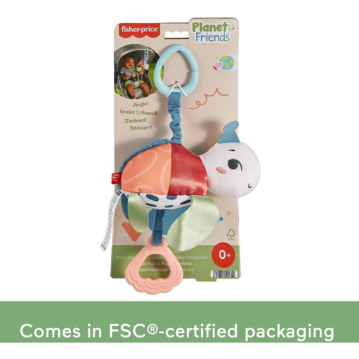 Description - Inspired by animals that are considered endangered or vulnerable, the Planet Friends Sea Me Bounce Turtle plush stroller toy from Fisher-Price uses fabric made from 80% post-consumer recycled plastics and comes in FSC-certified packaging to support responsible forestry. The toy features a variety of different tactile and visual elements for engaging sensory play and has a pull and release handle that activates the fun jingle sounds and bouncing action. The handle also doubles as a BPA-free seashell teether. This toy easily links to a stroller canopy, baby gym or diaper bag for travel use. Take-along plush sea turtle stroller toy with fun bouncing action & jingle sounds to delight your baby Contrasting colored & textured fabric made from 80% post-consumer recycled plastics BPA-free teether made with plant-based materials (minimum 20% bio-based material) Toy Link: 95% ISCC certified plastics (mass balance approach) Comes in FSC-certified packaging made with materials that support responsible forestry (FSC C172210, 2021) Smilestones: Bringing a smile to milestones! This toy helps foster Sensory Development with fun textures, bright colors & jingle sounds to engage your babys tactile, visual & auditory senses