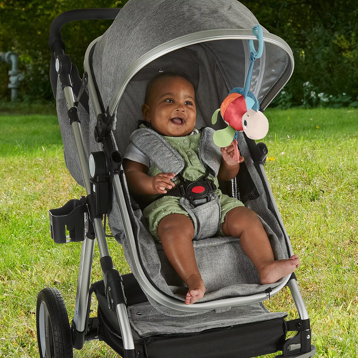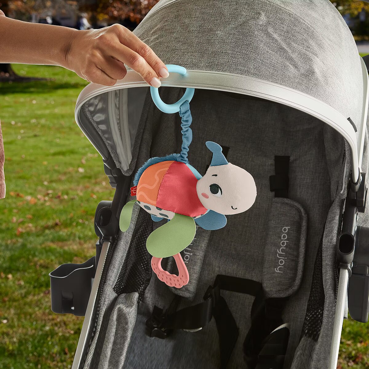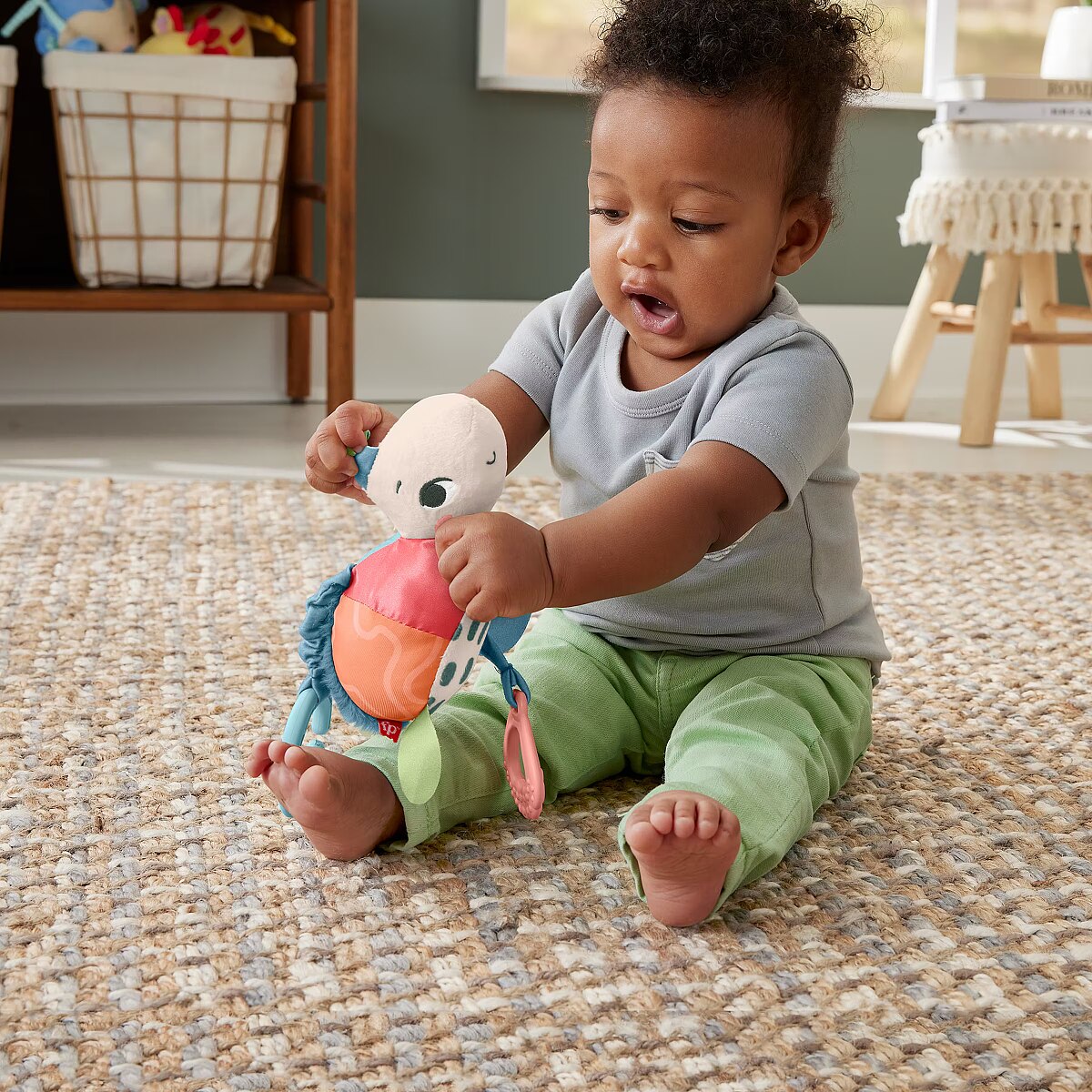 Description - Inspired by animals that are considered endangered or vulnerable, the Planet Friends Sea Me Bounce Turtle plush stroller toy from Fisher-Price uses fabric made from 80% post-consumer recycled plastics and comes in FSC-certified packaging to support responsible forestry. The toy features a variety of different tactile and visual elements for engaging sensory play and has a pull and release handle that activates the fun jingle sounds and bouncing action. The handle also doubles as a BPA-free seashell teether. This toy easily links to a stroller canopy, baby gym or diaper bag for travel use. Take-along plush sea turtle stroller toy with fun bouncing action & jingle sounds to delight your baby Contrasting colored & textured fabric made from 80% post-consumer recycled plastics BPA-free teether made with plant-based materials (minimum 20% bio-based material) Toy Link: 95% ISCC certified plastics (mass balance approach) Comes in FSC-certified packaging made with materials that support responsible forestry (FSC C172210, 2021) Smilestones: Bringing a smile to milestones! This toy helps foster Sensory Development with fun textures, bright colors & jingle sounds to engage your babys tactile, visual & auditory senses
