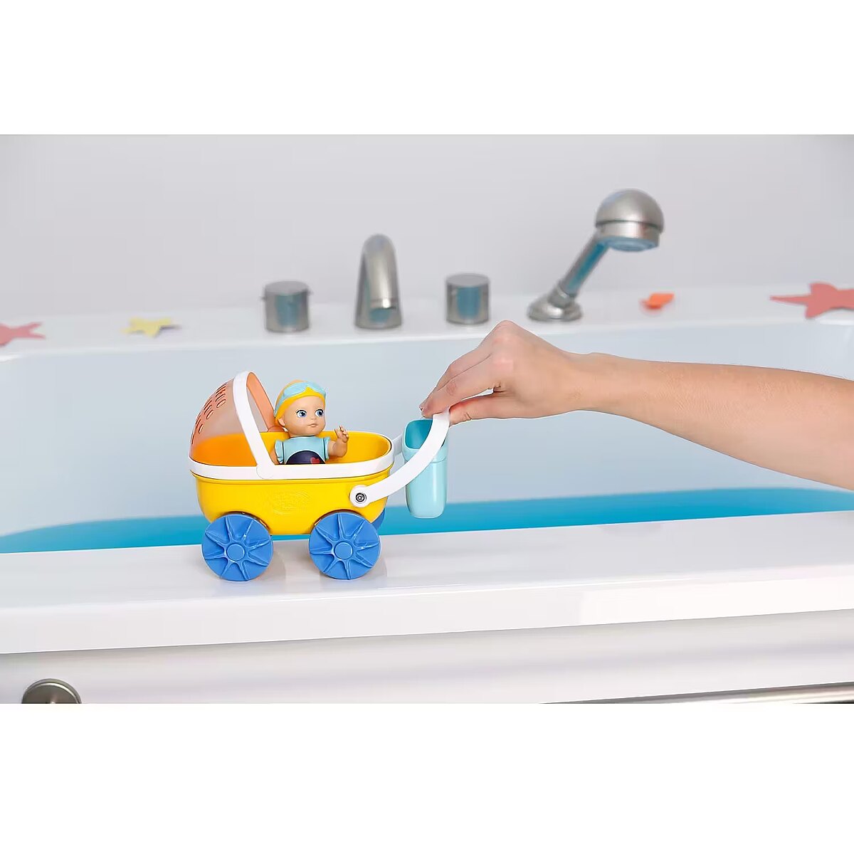 LongDesc - Bath time becomes an adventure with Emma and her magical pram! Suitable for children aged 1+ this colourful bath toy sparks imaginative play while keeping little ones engaged and entertained. Featuring an adorable pram with real working wheels for interactive play, a clever sunshade that transforms into a water strainer and a detachable basket for added pretend play fun. Emma’s ready to swim on her own, too—wind her arms backwards and watch as she swims front crawl or butterfly when her arms are released. With durable suction cups it easily attaches to the bathtub, making playtime secure and mess-free.. Make every bath a magical experience—Emma is ready to dive in!Learning Skills:- Fine Motor Skills- Hand and Eye Coordination- Creativity and imagination- Cause and EffectAnd there’s even more fun to explore! Check out the full BABY born Splish Splash range, packed with bathtub toys that make every bath an exciting and enjoyable experience for little ones. Suitable for children aged 1+