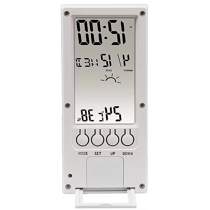 LongDesc - - Laikapstākļu tendence tiek attēlota, izmantojot trīs simbolus: saulains, mākoņains, lietains- Funkcijas un mērījumu vērtības tiek attēlotas caurspīdīgā displejā, lai uz galda būtu vieglākDigitāls caurspīdīgs temperatūras, gaisa mitruma, laika un laikapstākļu tendences displejsTermometrs:- Var pārslēgt starp grādiem pēc Celsija un pēc Fārenheita- Uzglabā min./max. temperatūras vērtībasHigrometrs:- Laika indikators: saulains, mākoņains, lietains (pamatojoties uz apkārtējās gaisa mitruma vērtību izmaiņām)- Apkārtējā gaisa mitruma min./max. vērtību saglabāšanaVides laika / kalendāra / modinātāja funkcija:- Laiku var pārslēgt starp 12 un 24 h formātu- Datuma un nedēļas dienas displejs- Modinātāja un snaudas funkcija- Izvelkama un atlokāma pamatne