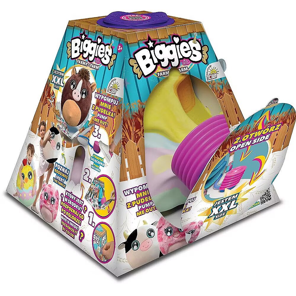Description - Amazing innovation and wow effect! Cute mascot animals in the shape of balls! Pump them out of the box! When you start pumping the mascot gets bigger and bigger. Suddenly it's so big, it opens the box by itself. Wow, the mascot is so big - XXL! Now 4 new adorable ball animals straight from the farm! Among them you will find a spotted cow, a pink pig, a yellow chicken and a bay horse! The mascots reach a diameter of 45 cm when inflated.