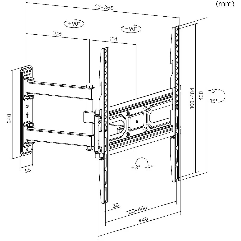 Other features - - Manufacturer: Maclean - Model: MC-647N - Maximum load: up to 35 kg - Adjustable tilt from +3° to -15° - Minimum/maximum horizontal distance: 100/400 mm - Minimum/maximum vertical distance: 100/400 mm - Adjustable distance from the wall: 63 mm to 358 mm - Solid metal construction, very easy mounting - Suitable for TVs from 32" to 70" (or larger if their weight does not exceed 35 kg and the VESA standard is compatible with the mount) - Supplied with a set of mounting screws for wall mounting and for screwing the TV to the wall, as well as mounting instructions - Powder coated (black) - Maximum load: up to 35 kg - Possibility to level the TV after installation +3/-3° - Possibility to adjust the degree of tilt from +3 to -15 degrees - Minimum/maximum horizontal distance: 100/400 mm - Minimum/maximum vertical distance: 100/400 mm - Adjustable distance from the wall. 63 mm to 358 mm - Suitable for curved TVs - Solid metal frame - Powder coated (black) - Very easy installation - VESA compatibility: 100x100, 100x150, 150x100, 100x200, 200x100, 150x150, 200x200, 300x200, 400x200, 300x300,400x300, 400x400 mm.