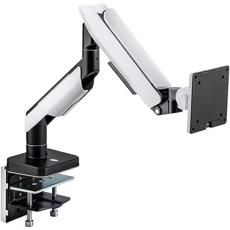 Other features - Suitable for 1749" monitors Number of monitors: 1 Mounting type: Table clamp or grommet mounting Weight capacity: 20 kg max. Maximum arm length: 458 mm Tilt: -20°/+50°, swivel: -90°/+90°, front panel rotatable: 360° Dimensions front panel WxH: 116x116 mm VESA compatibility: 75x75, 100x100 Features a heavy-duty and spring-assisted swing arm for steady movement Optimized tilting structure provide smoother adjustment for large screen Built-in lighting effect Cable management: Elegantly hides all cables connected to the monitor