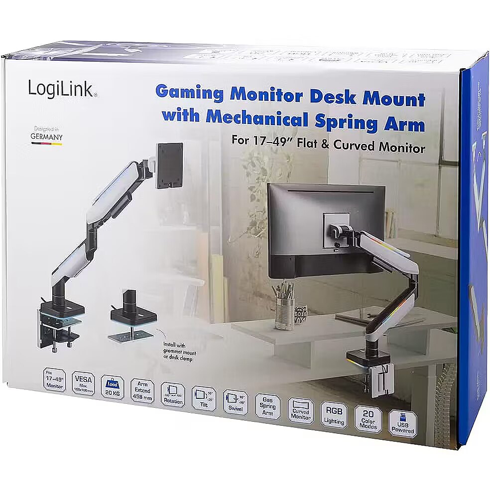 Description - Attach your monitor directly to your desk with the LogiLink gaming monitor mount. This allows you to use your screen with full freedom of movement and tilt, swivel or rotate it as you wish. The BP0162 also includes a built-in lighting effect that integrates seamlessly into any gaming station. The mount provides you with a great viewing experience while playing games and creates more space on the desk for other gaming accessories.