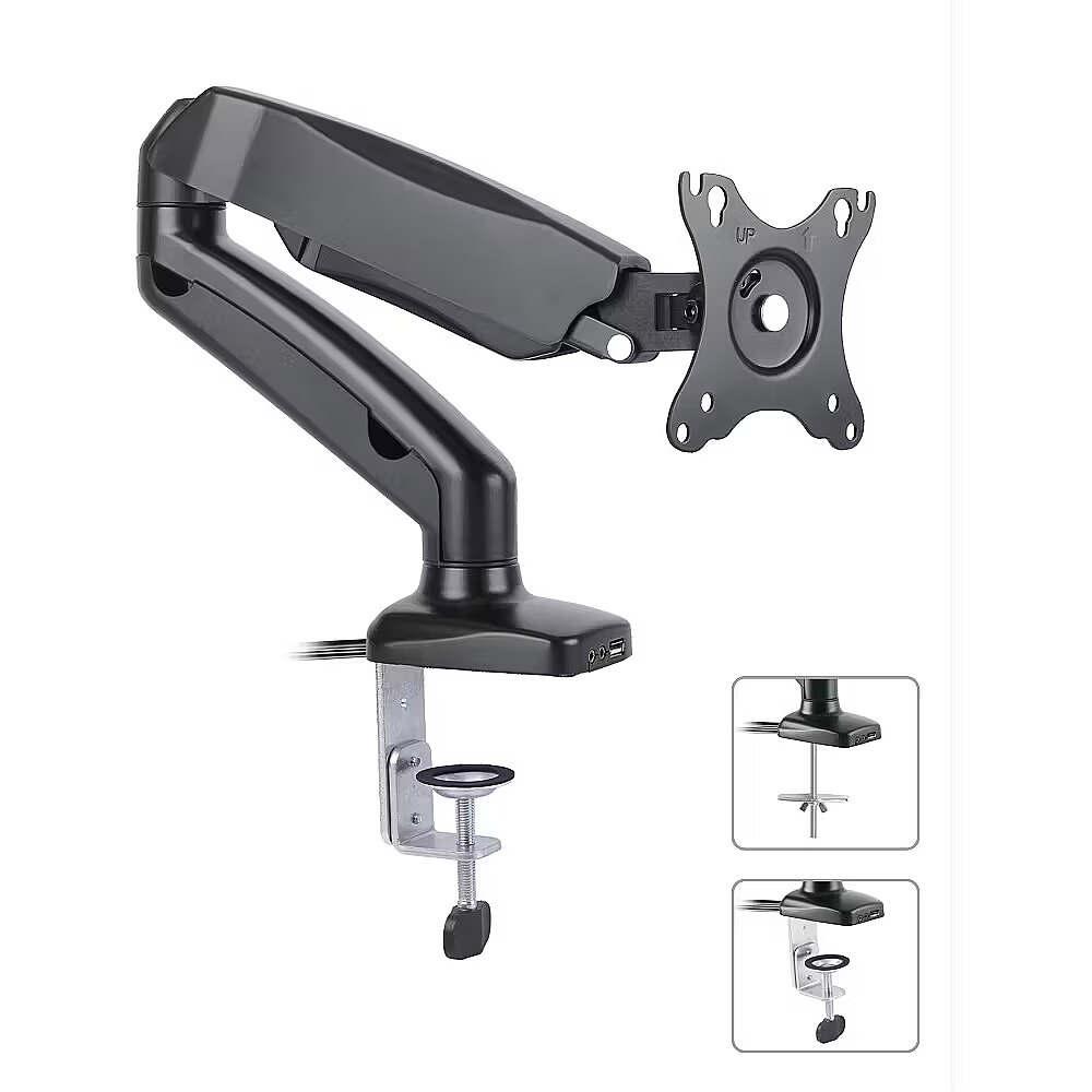 LongDesc - - Supports monitors from 13" to 27", also suitable for curved screens- With double fixing system: clamp or grommet hole mounting option- Gas spring with counterbalancing technology for easier arm adjustment- With integrated cable management system- Solid base with USB 2.0 port and built-in audio connections