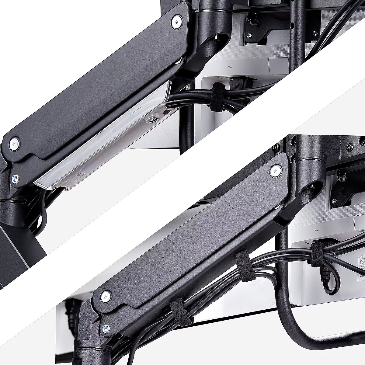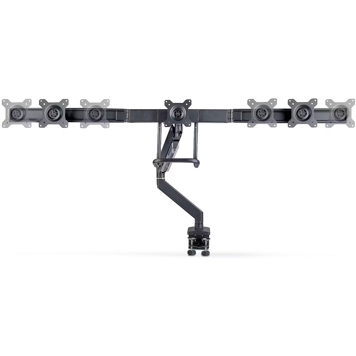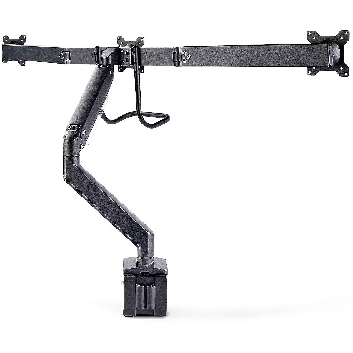 LongDesc - Triple monitor desk mount with support for up to 27" monitors with height adjustable crossbarThis crossbar monitor desk mount is designed to support up to three 27-inch displays, creating an ergonomic multi-monitor setup that provides an extensive viewing area for productivity. A built-in handle enables moving all monitors simultaneously, while the spring-assisted arm allows multiple adjustments to suit different ergonomic needs.Height Adjustment with One Smooth MotionThe spring arm enables toolless height adjustment of up to 13in (330mm) with effortless one-touch motion. The maximum arm extension is 24.8in (630mm), and the minimum arm extension is 4in (104mm). The weight capacity is 13.2lb (6kg) per VESA mount.Visual ExperienceThis triple monitor mount features micro height adjustment screws on the VESA plate that enable perfect alignment of all three monitors. This is ideal for bezel-less or slim bezel displays, helping to create a more extensive and seamless viewing area. The outer displays' VESA mounts slide along the crossbar, allowing further adjustments.Range of MotionThe monitor crossbar allows toolless adjustments of +/-15° horizontal swivel of the outer displays. The monitors' VESA mounts enable +/-10° horizontal swivel, +5/-15° tilt, and 360° screen rotation for portrait or landscape orientations.Cable ManagementTo maintain an organized workspace, the adjustable arm features a cable management channel along the underside to keep cables out of sight, reducing clutter and contributing to a tidy setup. A cable clip at the base maintains an organized workspace.The StarTech.com Advantage
