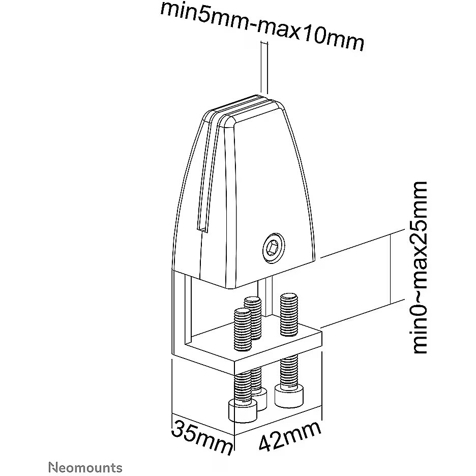 LongDesc - The Neomounts NS-CLMP25WHITE is suitable for desks with a thickness of 8-25 mm. The clamps guarantee a solid and secure installation of i.a the NS-GLSPROTECT safety screens or any other suitable screen you want to attach onto the desk. The clamps are secured directly onto the desk and therefore move smoothly with the height adjustable desk. Also available: For desks with a table top thicker than 25 mm, the NS-CLMP40 clamps - in black and white - are available. With these clamps, the screens can be mounted on desks with a work surface of 25-40 mm thick. Rather use table feet instead of table clamps? The NS-CLMPSTAND clamps with table feet offer the ideal solution.