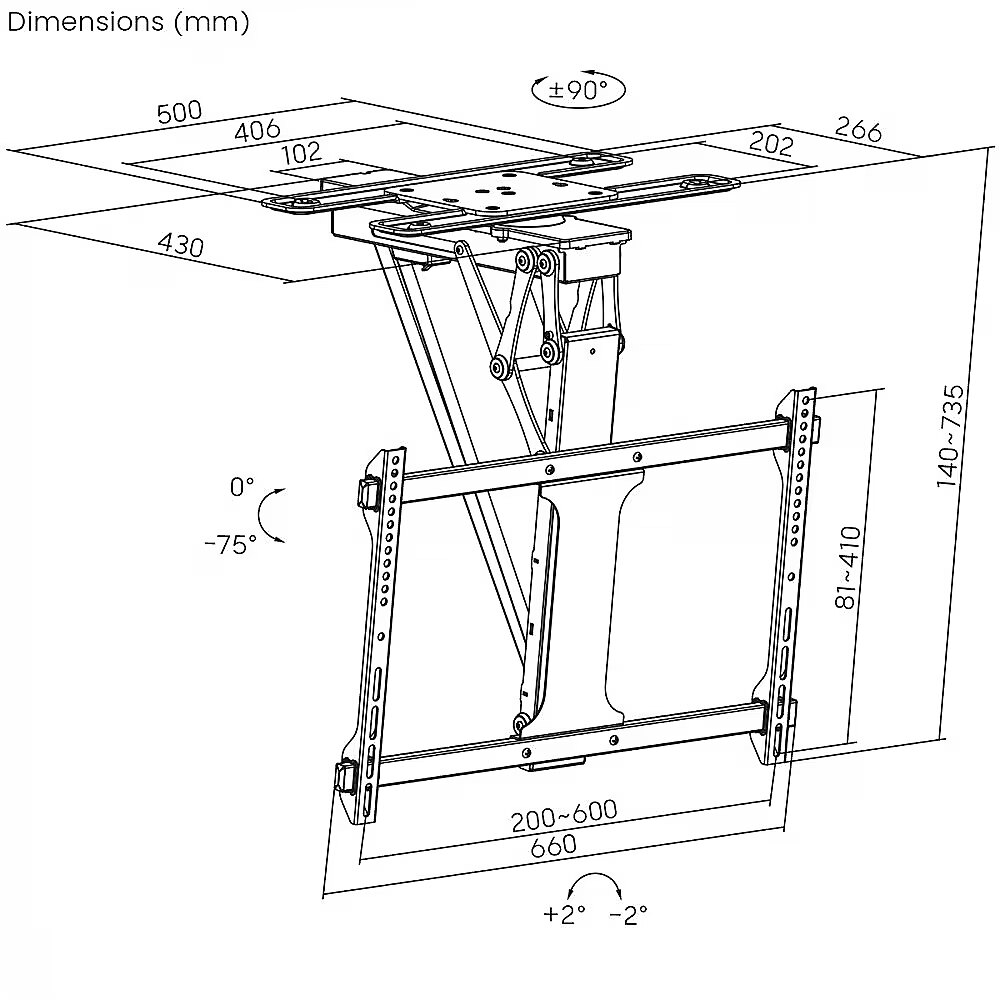 Other features - Tilt adjustment: from 0° to -75° Minimum/Maximum horizontal spacing: 200/600 mm Minimum/Maximum vertical spacing: 100/400 mm Solid metal construction, very easy installation Remote control with memory of two selected positions Controllable with free Tuya app Anti-collision system Powder coating Possibility to level the TV after mounting +2/-2° Power supply: AC 100 - 240 V, 50/60 Hz Remote control power supply: 2x AAA batteries (not included) Power cable length: 3 meters