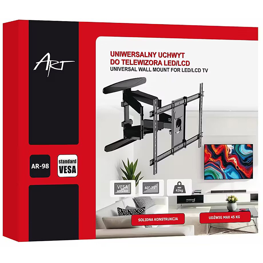 Description - R-98 ART LCD/LED TV Mount for 40-75" 45KG TVs, vertical/horizontal adjustment: 58-500mm: - VESA standard: 200x200-600x400 - Maximum TV weight: 45kg - Maximum mounting hole spacing: 600x400 - Vertical adjustment (tilt): -5 to 8 degrees - Horizontal adjustment (rotate): 160 degrees - Distance from the wall: 58-500mm - Includes a cable management system - A lock prevents the TV from sliding - An extensive mounting point cover system - A system for improving TV leveling by +/-3 degrees (Rotation) - The cable management system allows for effective cable management and protection against potential crushing
