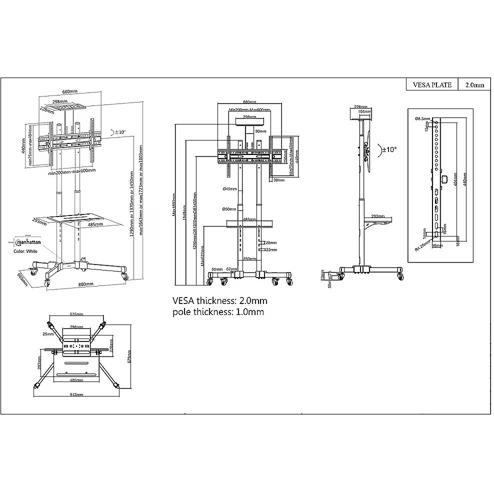 LongSummaryDescription - Manhattan Trolley Mount Stand for TV & Monitors, For screens 37" to 65", VESA compatability: all between 200x200 to 600x400mm - check the dimensions of the four mounting holes on back of screen to ensure it fits, Max 40kg, Black, LFD, Bracket, Lifetime Warranty. Maximum weight capacity: 50 kg, Minimum screen size: 94 cm (37"), Maximum screen size: 177.8 cm (70"), Minimum VESA mount: 200 x 200 mm, Maximum VESA mount: 600 x 400 mm. Height adjustment, Tilt angle range: -10 - 10°. Product colour: Black