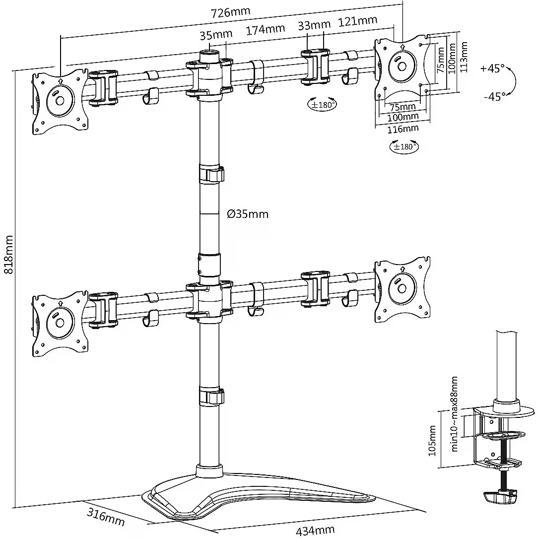 Apraksts - Universāls galda statīvs līdz pat četru monitoru vai televizoru uzstādīšanai, kas ļauj ievērojami paplašināt vizuālo darba telpu. Statīvam ir VESA standarta atveres (75x75,100x100,200x100), kas ļauj uzstādīt ekrānus ar 27 ekrānu diagonāli un svaru, kas nepārsniedz 8 kg uz roktura. Statīvs ļauj pagriezt ekrānu par 360° grādiem. Turklāt ir iespējama vertikāla regulēšana diapazonā līdz 45°. Aprīkots ar integrētu kabeļu vadības sistēmu. Statīvs ir izgatavots no augstas kvalitātes materiāliem un pārklāts ar pulverkrāsu melnā krāsā.