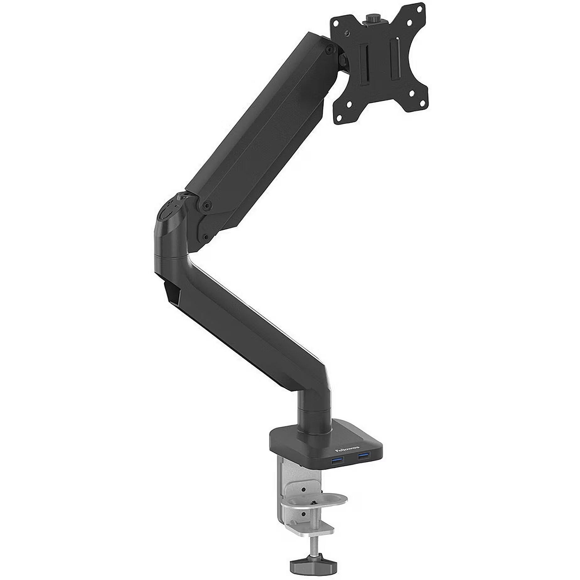 Description - Platinum Series Single Monitor Arm Increase valuable desk space and easily adjust your monitor to reduce eye, neck and shoulder strain Connect your favorite devices with 2 USB ports conveniently located at the base of the product Easy and effortless monitor adjustment with innovative gas spring technology Adjustable arm easily lifts monitor up and down through a 15” height range Mounts via clamp or grommet Minimize clutter with the intuitive cord management system Holds a monitor up to 30”/20 lbs Meets VESA mounting standards