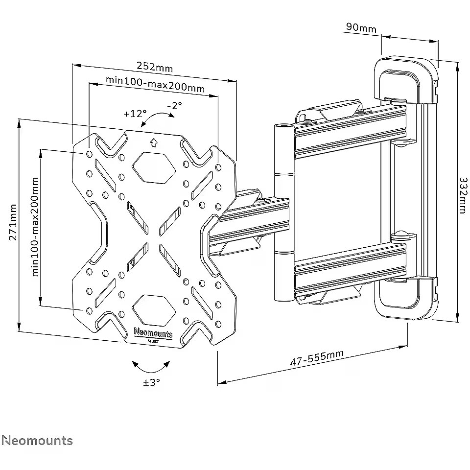 LongSummaryDescription - Neomounts WL40S-850BL12 TV mount wall 32-55" - full motion - fast installation. Maximum weight capacity: 40 kg, Minimum screen size: 81.3 cm (32"), Maximum screen size: 139.7 cm (55"), Minimum VESA mount: 100 x 100 mm, Maximum VESA mount: 200 x 200 mm. Tilt angle range: -2 - 12°, Swivel angle range: 0 - 60°, Angle of rotation: 6°, Distance to the wall (min): 4.7 cm, Distance to the wall (max): 55.5 cm. Product colour: Black