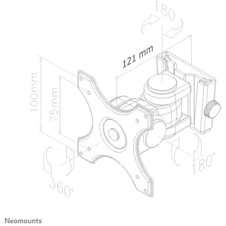 Description - The NewStar wall mount, model FPMA-W250BLACK is a tilt-, swivel and rotatable wall mount for flat screens up to 27”. This mount is a great choice when you want the ultimate viewing flexibility with your flat screen. Effortless pull the display out from the wall, position it in almost any direction, turn it around corners and then smoothly return it to the wall when finished. NewStars’ tilt- (180°), rotate (360°) and swivel (180°) technology allows the mount to change to any viewing angle to fully benefit from the capabilities of the flat screen. Depth of this mount is 12 centimetres. Cable management conceals and routes cables from mount to flat screen. Hide your cables to keep living room, bedroom or home cinema installation nice and tidy. NewStar FPMA-W250BLACK has one pivot point and is suitable for screens up to 27" (68 cm). The weight capacity of this product is 10 kg each screen. The wall mount is suitable for screens that meet VESA hole pattern 75x75 and 100x100mm. Different hole patterns can be covered using NewStar VESA adapter plates. Create a clean design ambiance for your flat screen TV in the living room, bedroom or home cinema. - Screens: 1 - VESA minimum: 75x75 mm - VESA maximum: 100x100 mm - Tilt: 180° - Rotation: 360° - Swivel: 180°