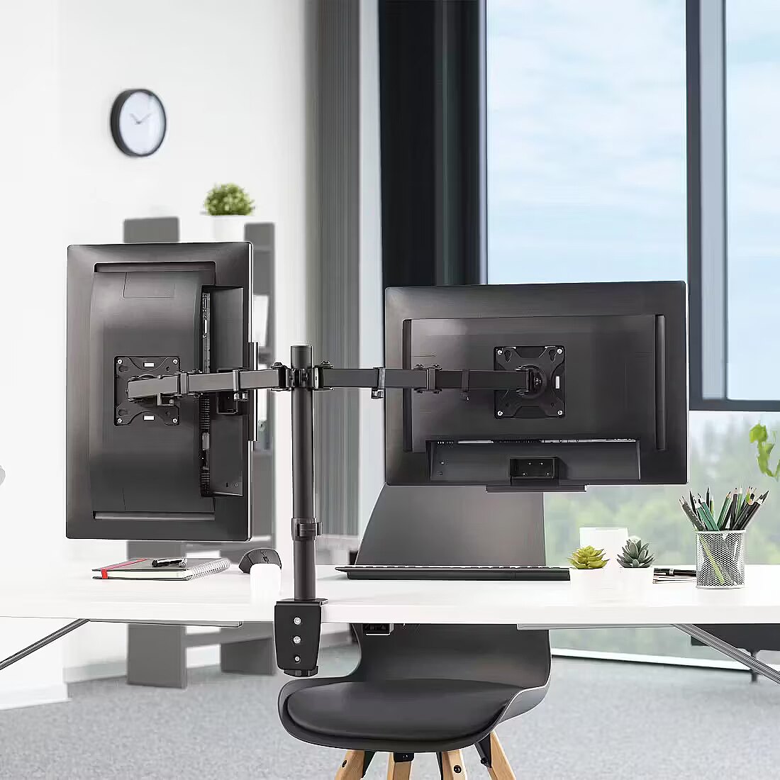 LongDesc - - The retaining system keeps your workplace tidy and allows you to work ergonomically- Easy fix system for easy and continuous adjustment of the screen- 360° rotation of the screen for horizontal or vertical orientation- Swivel arms for maximum rotation- Cable manager provides organisation and necessary strain relief