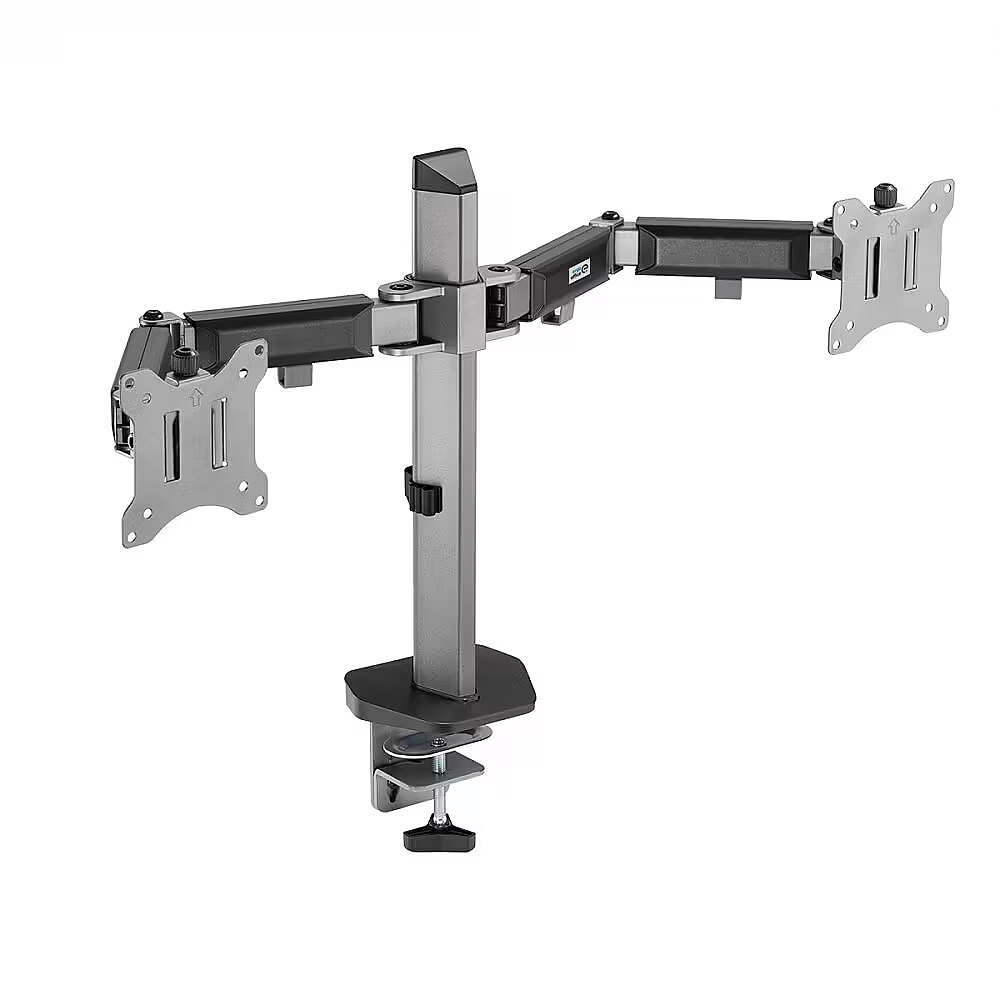 Apraksts - Deluxe Ergo Office 17"-32" šarnīrveida statīvs diviem monitoriem ER-449 Universāls stiprinājuma kronšteins LCD vai LED monitoriem ar galda vai kabeļu atverēm. Statīvs ir paredzēts monitoriem no 17" līdz 32" ar maksimālo svaru līdz 9 kg. ER-449 nodrošina lielisku darba komfortu, optimizē ergonomiku un redzamību, pateicoties slīpuma leņķim, pagriešanai, augstumam utt. Uz statīva var viegli piestiprināt VESA standarta monitorus: 75x75, 100x100 mm u. c. Viegla montāža ar galda skavu: Jūs varat uzstādīt statīvu ar galda skavu uz galda malas vai uzstādīt to ar galda atveri uz jebkuras galda virsmas. Komplektā ir divas skavas, kas ļauj statīvu piestiprināt pie galda dažādos veidos. Plašas regulēšanas iespējas: Katru eņģi var pagriezt par 90 grādiem pa labi un pa kreisi. Varat arī viegli mainīt ekrāna leņķi no portreta uz ainavu (pateicoties -180°/+ 180° pagriešanas iespējai). Var regulēt arī augstumu un slīpuma leņķi (-70°/+ 70°). Monitoru var pagriezt arī pa labi un pa kreisi. Kabeļu vadības sistēma: Integrētā kabeļu pārvaldības sistēma nodrošina kārtīgu un optimālu kabeļu pārvaldību. Jūs varat nostiprināt savus kabeļus turētājā un joprojām sekot līdzi saviem kabeļiem, kuriem varat piekļūt jebkurā laikā.