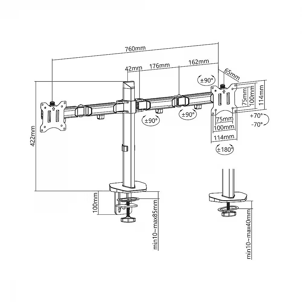 Other features - Maximum load: up to 18 kg (2x 9 kg) Adjustable tilt from -70 to +70 degrees Possibility of rotation: 90 degrees Cable grommets - High quality construction Very easy assembly Mount can be attached to tabletop or cable hole Suitable for monitors from 17" to 32" (or bigger if their weight does not exceed 9 kg and the VESA standard is compatible with the bracket) VESA 75x75, 100x100 mm