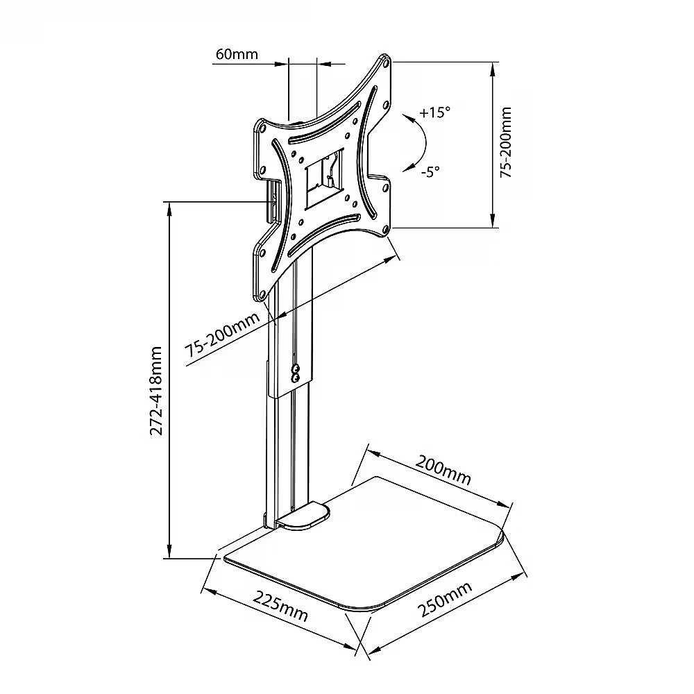 Dimensions - Maksymalne obciążenie: 20 kg Możliwość regulacji stopnia nachylenia: od +15° do -5° Minimalny/Maksymalny rozstaw w poziomie: 75/200 mm Minimalny/Maksymalny rozstaw w pionie: 75/200 mm Odległość telewizora od ściany: 60 mm Solidna, metalowa konstrukcja, bardzo łatwy montaż Wysoka jakość wykonania Lakierowanie proszkowe (kolor czarny) Wbudowana szklana półka z regulacją wysokości 272-418 mm Wymiary półki: 250x200 mm Maksymalne obciążenie półki: 5 kg VESA: 75x75, 100x100, 100x200, 200x200 mm