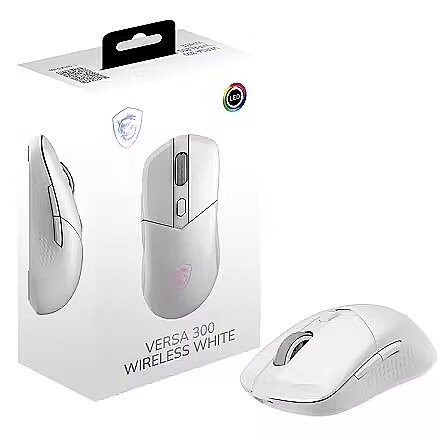LongDesc - The VERSA 300 WIRELESS WHITE is a lightweight and versatile mouse, ergomomically designed for both gamers and professionals, weighing in at just 60 grams. It offers flexible connectivity options with MSI SWIFTSPEED 2.4 GHz wireless, Bluetooth, and wired for various setups. Featuring a highly accurate optical sensor with up to 8,000 DPI, it ensures precise tracking and responsiveness. Built with micro switches rated for over 30 million clicks and customizable RGB lighting, the VERSA 300 WIRELESS delivers durability, performance, and comfort.ERGONOMIC & SUPPORTIVE HANDSHAPEUsing a symmetrical design makes it comfortable for both right- and left-handed users. Its ergonomically optimized shape accommodates various hand sizes and is tailored to support a wide range of grip styles, including palm, claw, and fingertip grips. This versatile form ensures a secure and comfortable hold with precise control and comfort during extended use.DIAMOND-PATTERNED SIDEGRIPSThe exclusive diamond-patterned anti-slip sidegrips allow gamers to hold the mouse firmly in hand for precise maneuvers with excellent feel.PERFECT PRECISIONPowered by the advanced PixArt PAW3104DB Optical Sensor, the mouse delivers pinpoint accuracy with a maximum DPI of 8000 for responsive and precise movements. It also features preset DPI levels of 400 / 800 / 1600 / 2400 / 3200 / 4000 / 6400 / 8000, allowing quick adjustments for different scenarios.PRECISE, SATISFYING CLICKSFeaturing micro switches designed for precision and durability with a lifespan of at least 30 million clicks. These high-quality switches offer a satisfying, tactile response for consistent and accurate input. Built for intense use, they ensure reliable performance and long-lasting responsiveness, making them perfect for any task.VERSATILE CONNECTIVITYThis product offers seamless multi-mode connectivity with MSI SWIFTSPEED 2.4G Wireless, Bluetooth 5.3, and USB 2.0. Letting users easily switch between modes to match their needs for gaming or everyday use.LIGHTWEIGHT, STAMINA, SMOOTHWeighing just 60 grams, this ultra-lightweight mouse is designed for quick, precise movements with minimal effort, reducing fatigue during extended gaming sessions or long work hours for a comfortable experience. With a battery life of up to 50 hours on a single charge, it ensures reliable, uninterrupted performance throughout the day. Using pure PTFE skates helps to deliver exceptional glide and minimal friction on various surfaces, enhancing tracking accuracy and responsiveness.