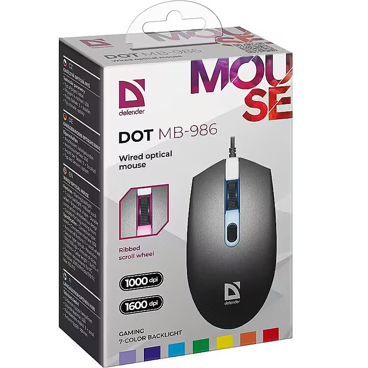Description - Mouse Defender DOT MB-986 Optical 7 colours 1000dpi 4P Gaming backlight 7 backlight colours Ribbed scroll wheel Ergonomic shape Durable and ambidextrous design Ideal for long time working Push button to change resolution
