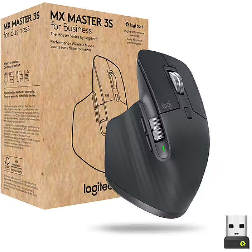 Specifications:Model: MX Master 3SType: Wireless mouse (right-hand)Connection: 2.4 GHz USB receiver + BluetoothSensor: Darkfield opticalMax resolution: Up to 8000 DPIButtons: 7 programmableDevice switching: Up to 3 devicesScroll wheel: MagSpeed electromagneticBody material: Aluminum frame, soft-touch finishWeight: 141 gDimensions: 124.9 × 84.3 × 51 mmCompatibility: Windows 10/11, macOS 11+, Linux, ChromeOSBattery: Built-in Li-Ion, USB-C chargingBattery life: Up to ~70 hoursFeatures: Glass surface tracking, thumb wheel, device switch, fast charging