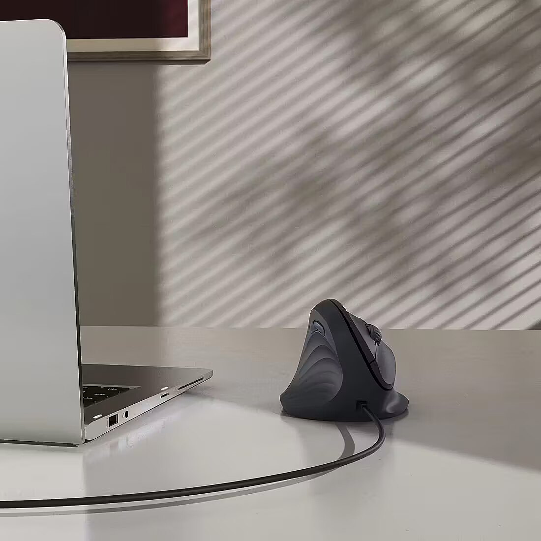 LongDesc - Convenient, precise and silent: The cabled, ergonomic vertical mouse allows left-handed people to work enjoyably and without pain on the PC or laptopVertical mouse for ergonomic workingBye bye mouse arm: the ergonomic mouse supports a natural angle between the hand and wrist at an ergonomic workstation, thereby preventing shoulder pain, tendon sheath inflammation and pain in the wristAI assistant for many programsMore productive with artificial intelligence: Assist button activates the cross-program AI assistantWhisper-quiet buttonsQuiet mouse, no clicking noises: whisper-quiet buttons ensure undisturbed and relaxed working with the wireless mouseBrowser buttonsHandy side buttons: the browser buttons on the wireless mouse support the forward/back function for easy navigation, e.g. in web browsers, Outlook, etc.USB receiver can be stowedA place of its own: the stowable USB receiver can be transported in a space-saving manner inside the mouse housing> 20% from demonstrably recycled sourcesAnd so the circle closes: this product is made up of at least 20% recycled materials, enabling us to take part in an eco-friendly cyclePlastic-freePackaging with a clear conscience: our packaging is 100% plastic-free, enabling us to reduce plastic waste and increase its recyclability