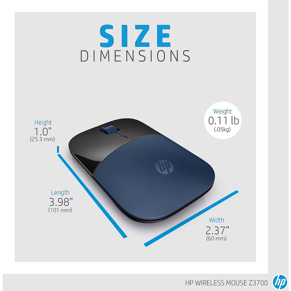 LongSummaryDescription - HP Z3700 Blue Wireless Mouse. Form factor: Ambidextrous. Movement detection technology: Optical, Device interface: RF Wireless, Movement resolution: 1200 DPI, Buttons type: Pressed buttons, Buttons quantity: 3, Scroll type: Wheel. Power source: Batteries. Product colour: Blue