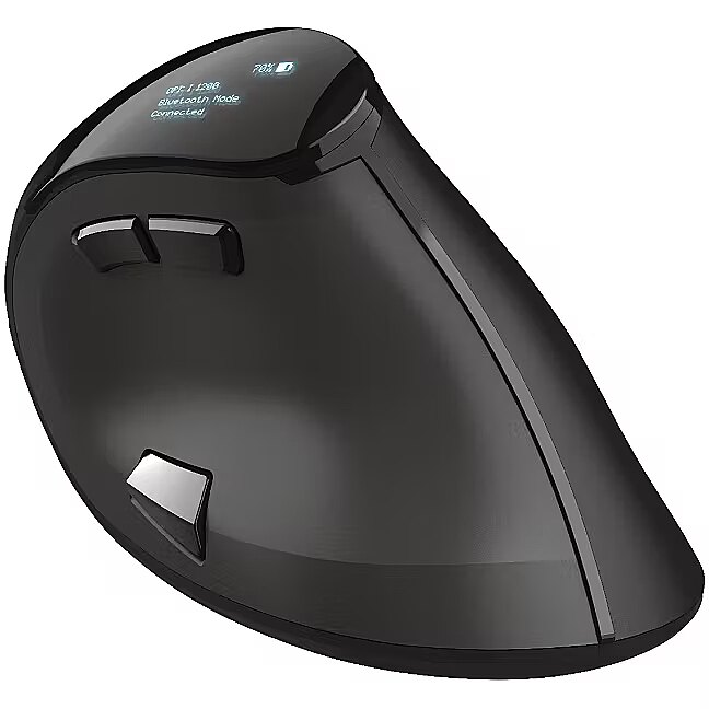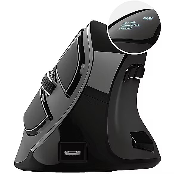 Stop straining your wrists during long workdays. With the Trust Vox Wireless Rechargeable Ergonomic Mouse you continue working for as long as you want. The vertical shape of this ergonomic mouse reduces wrist and arm strain, while the adjustable buttons and the LED display menu help you improve your workflow. Made for Hard Work While the vertical design is comfortable to hold, a mouse is nothing if it’s not functional. That’s why the Voxx is a real work horse with 9 buttons. Use the DPI button to adjust your cursor speed (1200, 1600, 2000 and 2400 DPI), and the side-buttons to quickly go back and forward in your browser. Or adjust the buttons to your liking. Everything in Sight Ever changed a setting and wandered what your current mouse settings are? Well, no more. The Vox Wireless Rechargeable Ergonomic Mouse has a handy LED display that lets you keep track of your most important settings, like button functionality, DPI, connection status and remaining battery life. You can finally concentrate on what’s important: getting work done. Your Kind of Wireless The Voxx can be used just the way you would like. Use it wirelessly via Bluetooth on supported laptops, tablets, even smartphones. And if your laptop or PC doesn’t support Bluetooth, the included USB Micro Receiver will save your day. It’s conveniently stored within the mouse itself, so it’s never out of reach. You can even use this mouse after you run out of battery, thanks to the charging cable.Ergonomic vertical design reduces arm and wrist strainLED display shows battery and connection status, wireless mode and DPI settingOptimise your workflow by reassigning button functions via the LED display menu *Can be used via USB or Bluetooth on your PC, laptop, tablet or smartphoneEnvironment-friendly, no need for batteries due to built-in rechargeable battery9 Buttons, including easily accessible thumb operated side buttons (forward and back) and top buttons with extra gripPerfect cursor control with adjustable speed (1200-1600-2000-2400 DPI)Energy saving on/off switchFunctionality programmable buttons may vary between OS