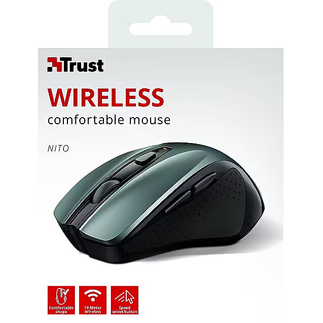 LongDesc - Full Grip On Your WorkWith the Trust Nito you’ve got one less thing to worry about during your workday. This wireless mouse has an ergonomic design, convenient thumb buttons and a wireless range of 10 metres. You even have full control over the speed of your cursor. The rubber inlay ensures you’ve got a firm grip on this mouse, so don’t worry about anything other than the job at hand.DesignThanks to the ergonomic design of the Trust Nito you’ll keep using this mouse comfortably, even during long days. The two thumb buttons, which allow you to easily browse through files and the web for example, are conveniently placed. And due to the rubber inlay your hand stays where you want it to be; with a firm grip on your work.Wireless RangeYou move around a lot during your day? Well, don’t worry about it. The Nito has a wireless range of 10m, which allows you to move around freely. The USB micro receiver makes sure of it. And when you’re done working, just place the receiver in the mouse itself so you’ll always know where to find it.IndicatorThere’s a LED indicator on the Trust Nito which tells you when it’s becoming time to replace the battery, so you won’t be surprised by it during an important presentation. It also tells you which DPI setting you’re using, because you can choose from 5 different speeds (800-1200-1600-1800-2200 DPI). Control is everything.