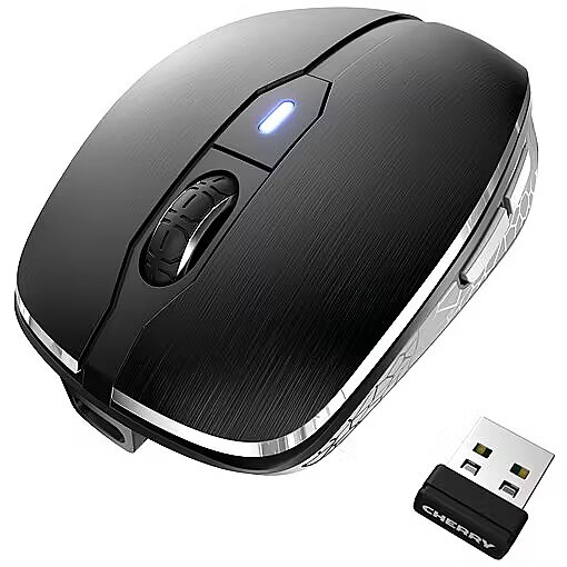 LongDesc - The CHERRY MW 8C ADVANCED combines fine materials, a timeless design and the very latest technology to form a top class wireless mouse. The anodized aluminum surface, rubber side parts and compact design mean that it fits snugly in the user’s hand. The first time the user touches the device, it becomes clear that this mouse stands out from the crowd and is aimed at users with sophisticated requirements. The highly precise sensor with a laser LED allows the mouse to be used on nearly every surface, including glass. The resolution can be set in four stages at the touch of a button: 600, 1,000, 1,600 or 3,200 dpi. This means the mouse is ready for use with high-resolution 4k monitors. The installed rechargeable lithium battery can be simply charged with the supplied USB cable – even while you work. The generous capacity of 550 mAh means that one charge suffices for several weeks of uninterrupted productivity. A two-colour status LED provides the user with information on the battery status, the charging status, the selected resolution or the connection status at all times.Unlike a conventional mouse, the wireless mouse can be connected either with the supplied 2.4 GHz wireless USB receiver or via Bluetooth®. You can change connection types quickly using a switch on the base of the mouse. This allows e.g. a laptop to be connected via Bluetooth® and a PC to be connected via a regular wireless connection and both to be operated with the same mouse. Simply press the switch to toggle between the two devices. The data are transferred using an AES-128 encryption in both cases. In addition to this, the CHERRY MW 8C ADVANCED has a number of other impressive features and subtle details. A highly durable mouse wheel with optical scanning, a magnetic latch for the USB receiver as well as a transport pouch. The attention to detail of this mouse leaves nothing to be desired and it is equally suitable for mobile and stationary applications.