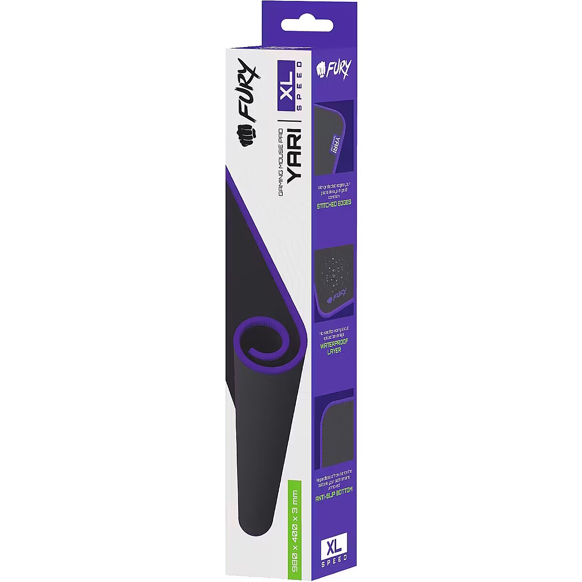 description_lv - Fury Yari Speed XL (NFU-2260) ir augstas veiktspējas peles paliktnis, kas paredzēts spēlētājiem, kuri vēlas ātrumu, precizitāti un izturību. Tehniskā specifikācija: Izmērs: 980 × 400 × 3 mm Virsma: Gluda auduma virsma ātrai peles kustībai Pamatne: Neslīdoša gumijas bāze Malu apdare: Apšūtas malas, kas novērš nodilumu Ūdensizturība: Ūdensizturīgs pārklājums Krāsa: Melna ar violetiem akcentiem Svars: Aptuveni 837 g