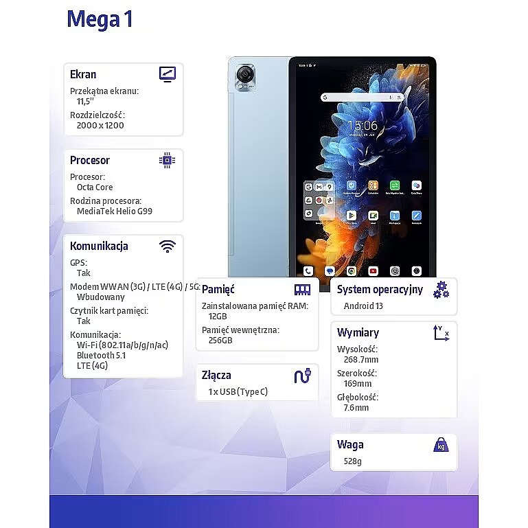 Description - TABLET MEGA1 11" 256GB MEGA1 BLUE ​Power adapter not included
