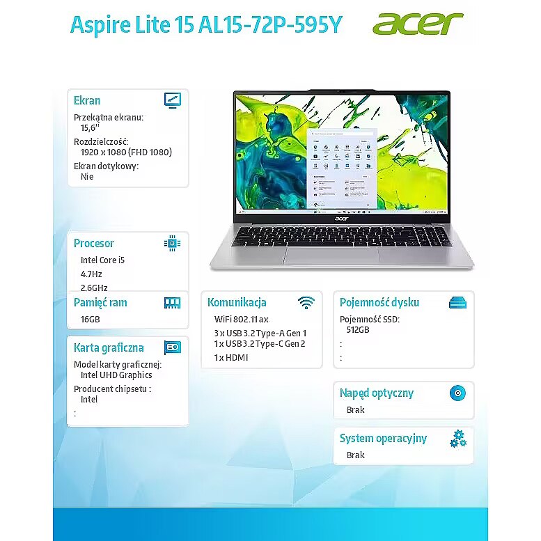 name - Notebook Aspire Lite 15 AL15-72P-595Y i5-13500H, 15.6 FHD IPS, 16GB, 512GB SSD, No OS, silver