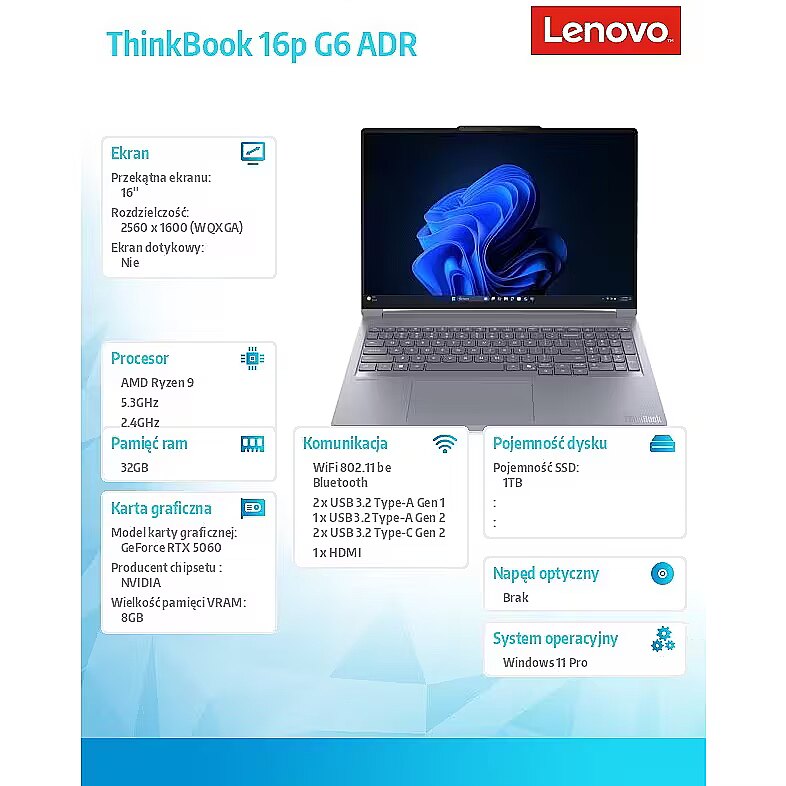 LongSummaryDescription - Lenovo ThinkBook 16p G6 ADR. Product type: Laptop, Form factor: Clamshell. Processor family: AMD Ryzen™ 9, Processor model: 8940HX, Processor frequency: 2.4 GHz. Display diagonal: 40.6 cm (16"), HD type: WQXGA, Display resolution: 2560 x 1600 pixels. Internal memory: 32 GB, Internal memory type: DDR5-SDRAM. Total storage capacity: 1 TB, Storage media: SSD. On-board graphics card model: AMD Radeon 610M. Operating system installed: Windows 11 Pro. Product colour: Grey