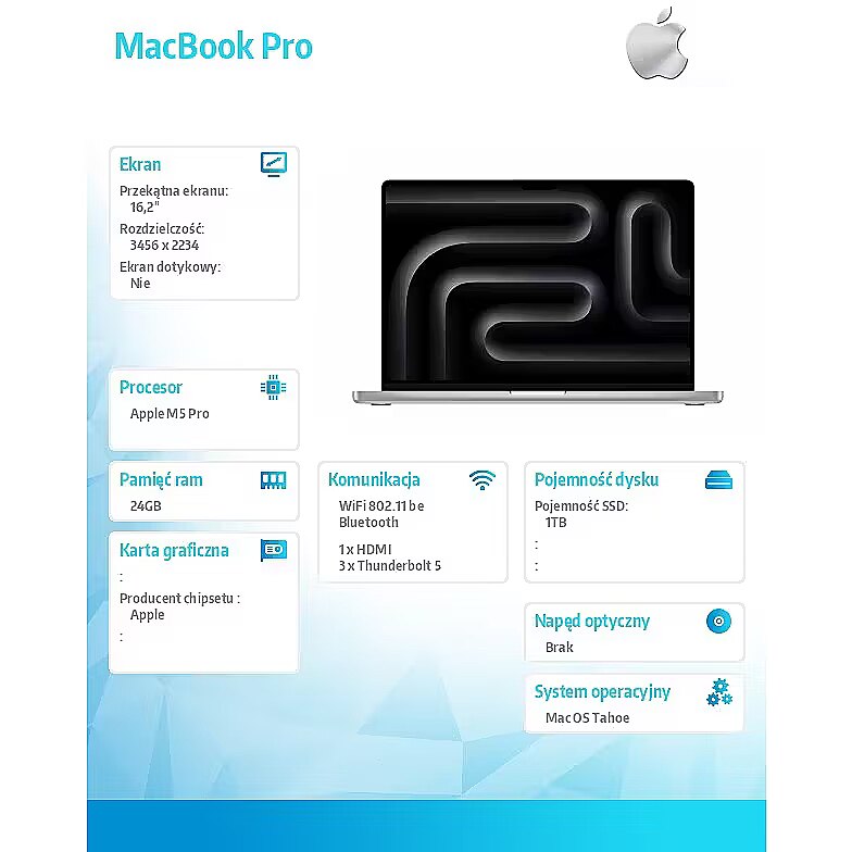 Name - Apple Macbook Pro - M5 Pro (18/20) | 16,2" | 24GB | 1TB | Mac OS | Srebrny