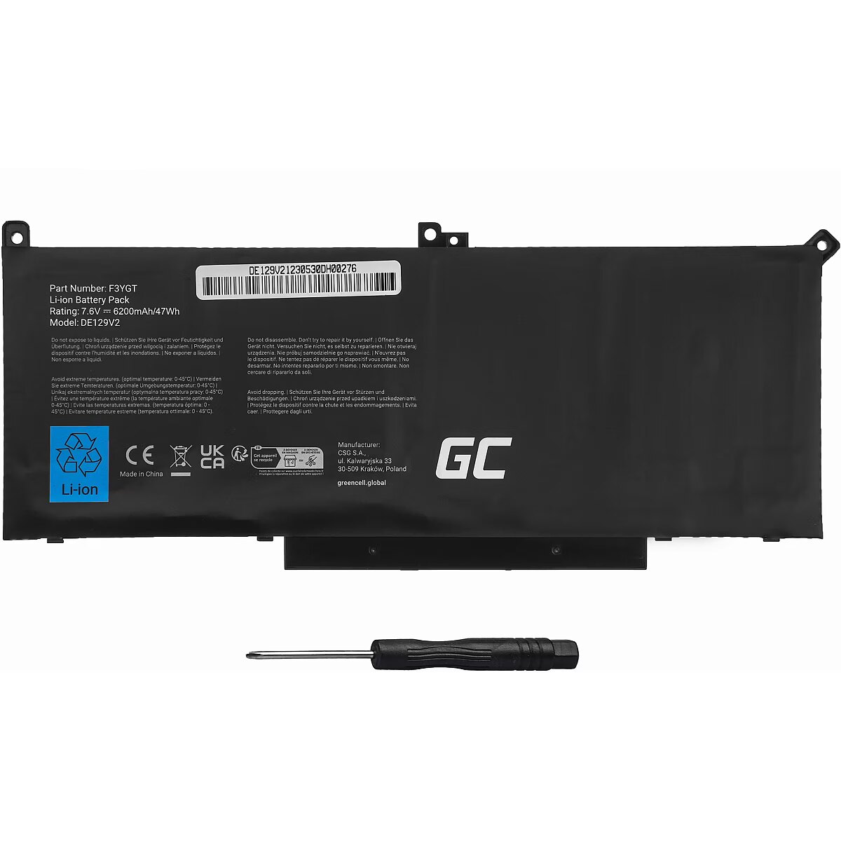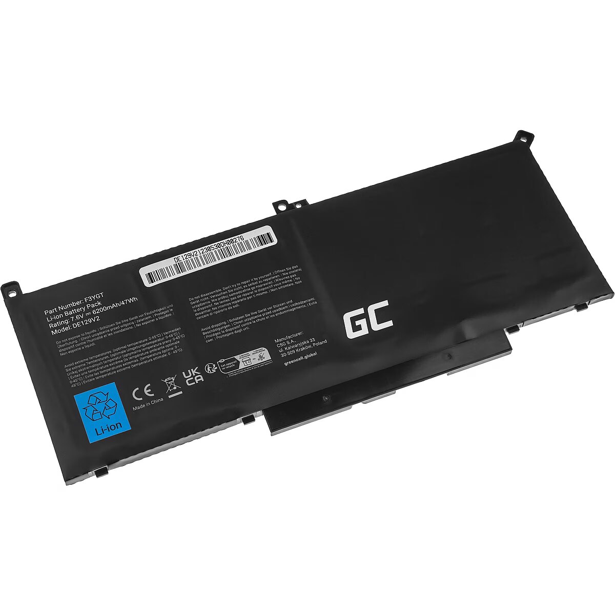 Description - F3YGT Battery 7.6V 6200mAh for Dell Latitude 7280 7290 7380 7490 The Green Cell battery is a high-quality model designed for the Dell Latitude 7280 7290 7380 7390 7480 7490 laptop. The battery is equipped with durable and efficient Green Cell cells, which guarantees reliability and long operating time. The battery is a carefully designed model dedicated to a specific laptop, which ensures safe operation and full efficiency of the computer. Original Green Cell battery for your laptop High efficiency thanks to the use of Green Cell cells Perfect compatibility thanks to perfect electronics reproduction