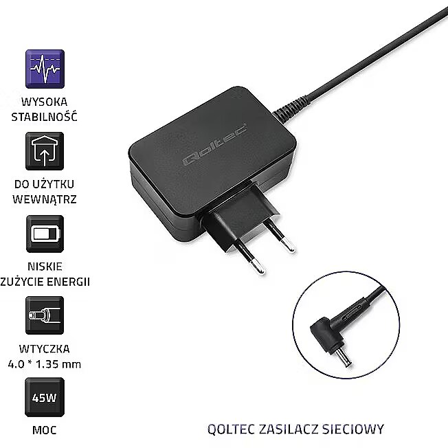 Description - A reliable energy source for your satisfaction Reliability is crucial for you? Choose the Qoltec dedicated power adapter for Asus laptops. It is ideal for home or office, as a main or auxiliary power supply. It is made of the highest quality materials and the technologies used will allow for low power consumption and high efficiency. It comes complete with a velcro cable management system, allowing you to adjust the cable length to your needs. Designed specifically with your safety in mind Invest in safety and it never loses its value. Qoltec power supplies are made of the highest quality materials and are well worth your attention. It provides the expected stability of operation thanks to special protections: Against overvoltage: protects against under- or over-voltage, Overload protection: protects against overloading the power line, Short-circuit: protects against short circuits in the power supply circuit, Thermal: protects against damage caused by overheating. Fitting a power supply - we give you a helping hand It is very important to choose the right power adapter for your laptop model. Forced downtime can be reduced to a minimum by following these few simple rules: You can read the basic parameters from the label on the bottom of your laptop, these will be: POWER (W), VOLTAGE (V), AMPERAGE (A). The following points will dispel any doubts that may arise when choosing equipment: 1. Power (W) This figure represents the minimum value that a new power supply should have. There is nothing to prevent the use of a higher wattage product. This means that the power supply is under less strain and will therefore heat up less. 2. Current (A) here, as with POWER, the value on your new power supply can be equal to or greater than the value on the laptop's rating label. 3. Voltage (v) the number for this parameter is more strictly required. Only +/- 0.5V variation is allowed. The last and equally important issue is the plug. Without it there is no use! There are no exceptions here, it must be identical to the original. The size given means the outer diameter and the inner diameter of the plug. If a comparison on the basis of the presented picture is not enough, it will be necessary to measure it, which will finally reassure you in your choice.