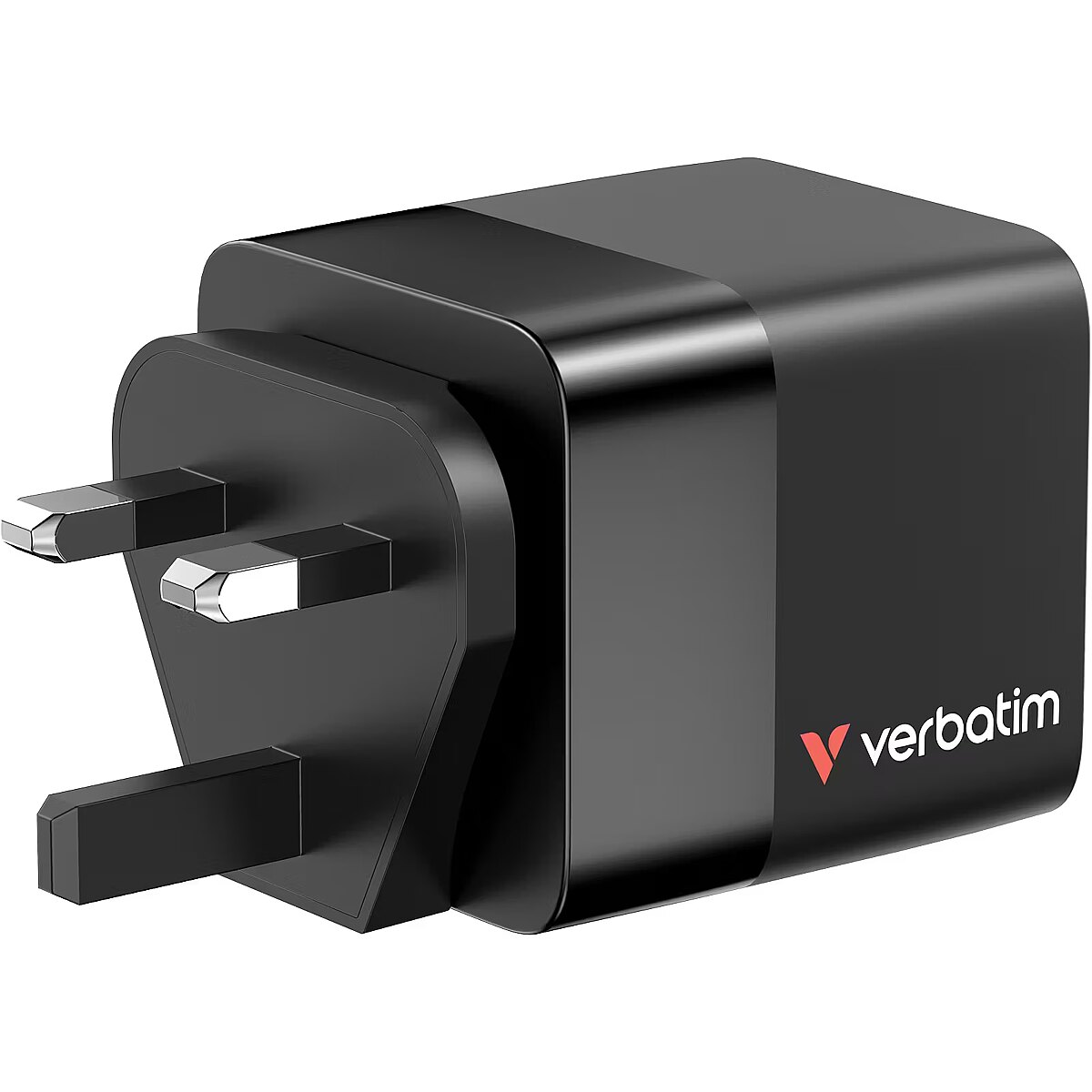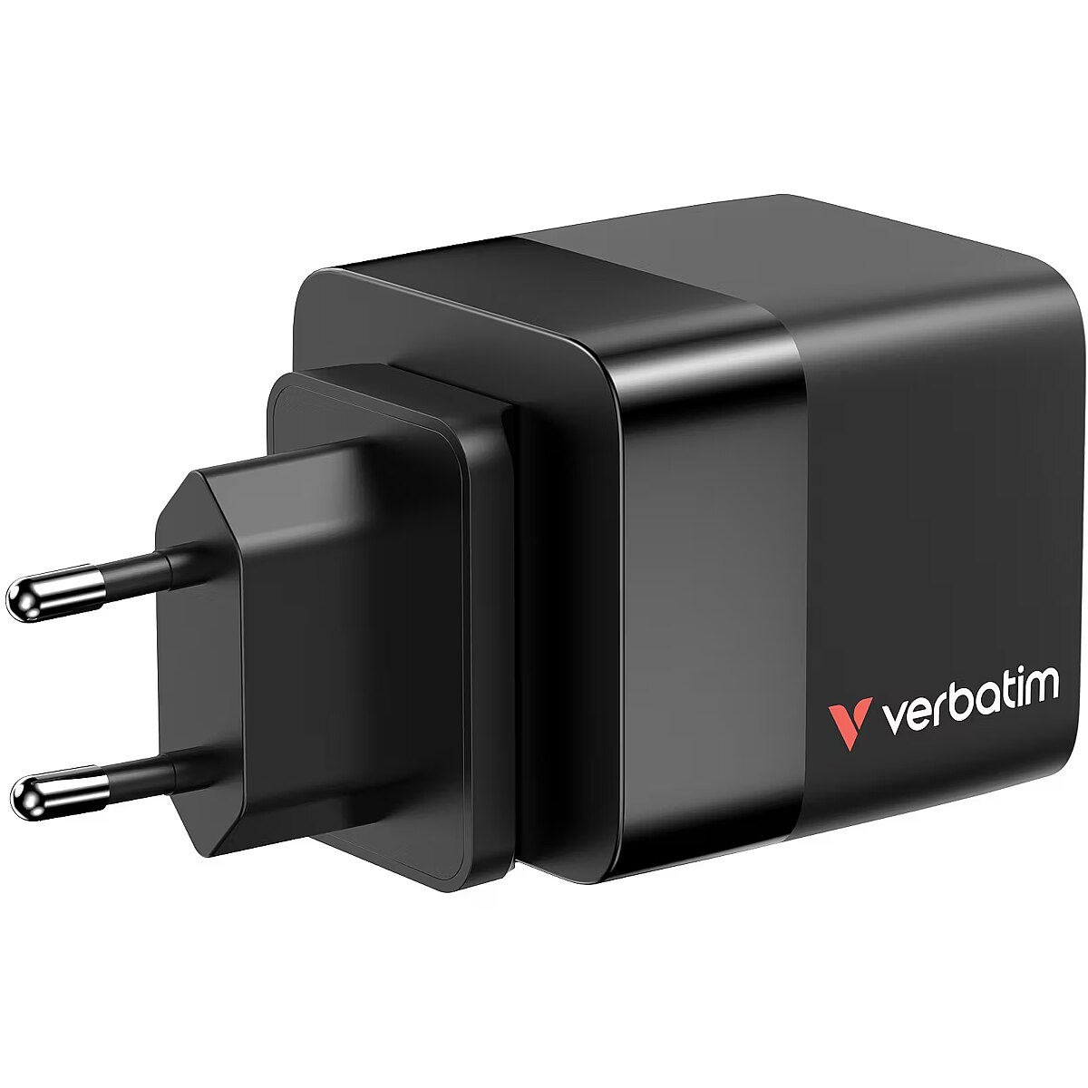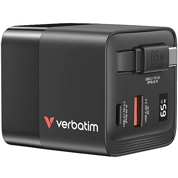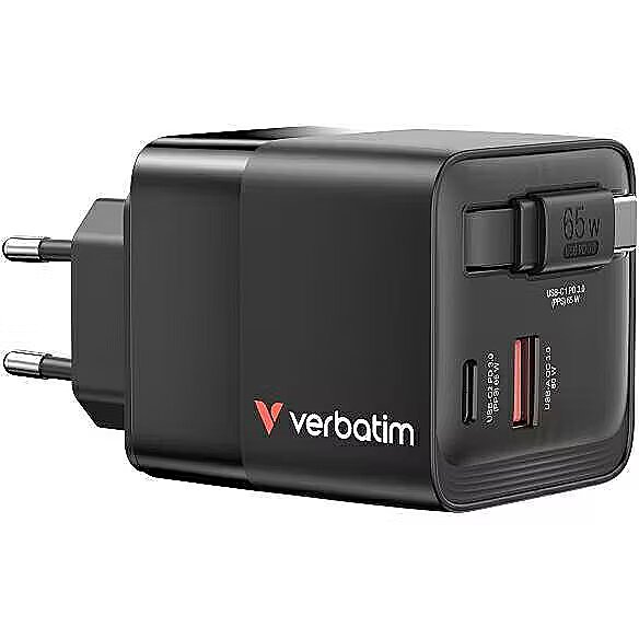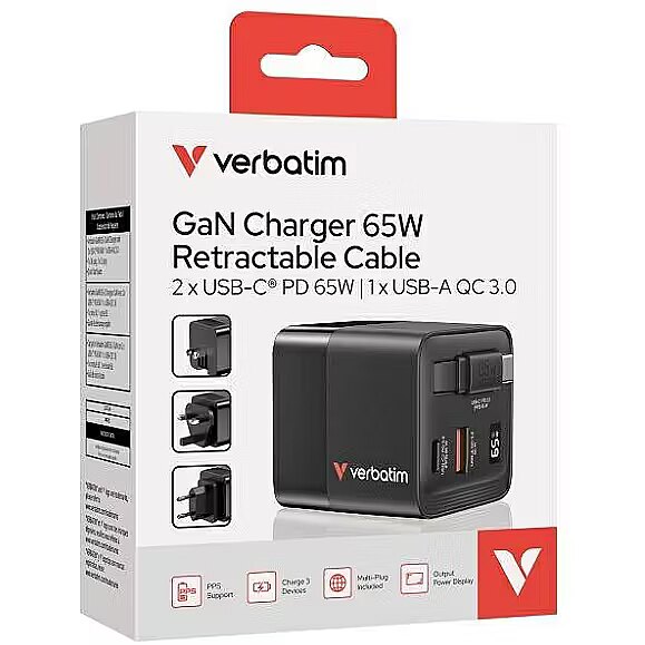LongDesc - Verbatim's 65W GaN Charger combines a USB-C® and USB-A port plus an integrated retractable USB-C cable into a compact, palm-sized design. Capable of charging up to 3 devices simultaneously, the USB-C port and cable support PD 3.0 (Power Delivery) at 65W while the USB-A port supports QC 3.0. Ideal for the office, home or travelling to power your laptop, tablet, smartphone, gaming devices, and more.The retractable USB-C cable extends to over 80cm , reducing the need for additional cables when on the move and the output display shows the total amount of power output being used, whether that is from one or a combination of ports.The GaN Charger can be used in multiple countries. The US prongs are foldable and it includes replaceable EU and UK plugs. The ultimate travel companion.GaN TechnologyGalliam Nitride (GaN) technology delivers high-powered, fast, efficient charging, and generates less heat. GaN chargers are smaller and lighter than traditional silicon-based chargers, making them ultra-portable and ideal for travel.Safe and ReliableThe GaN charger is made with high-quality, flame-resistant materials and features four safety protection systems, including over-current protection, over-voltage protection, short circuit protection, and over-temperature protection to ensure your safety while charging.