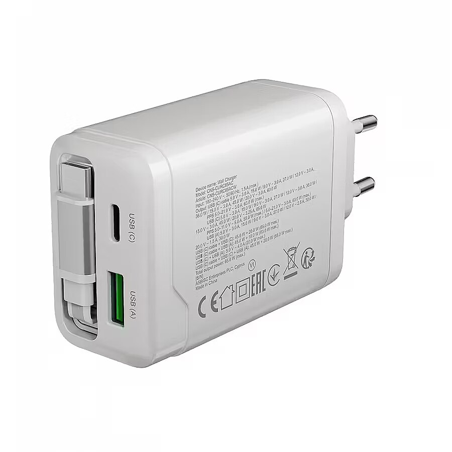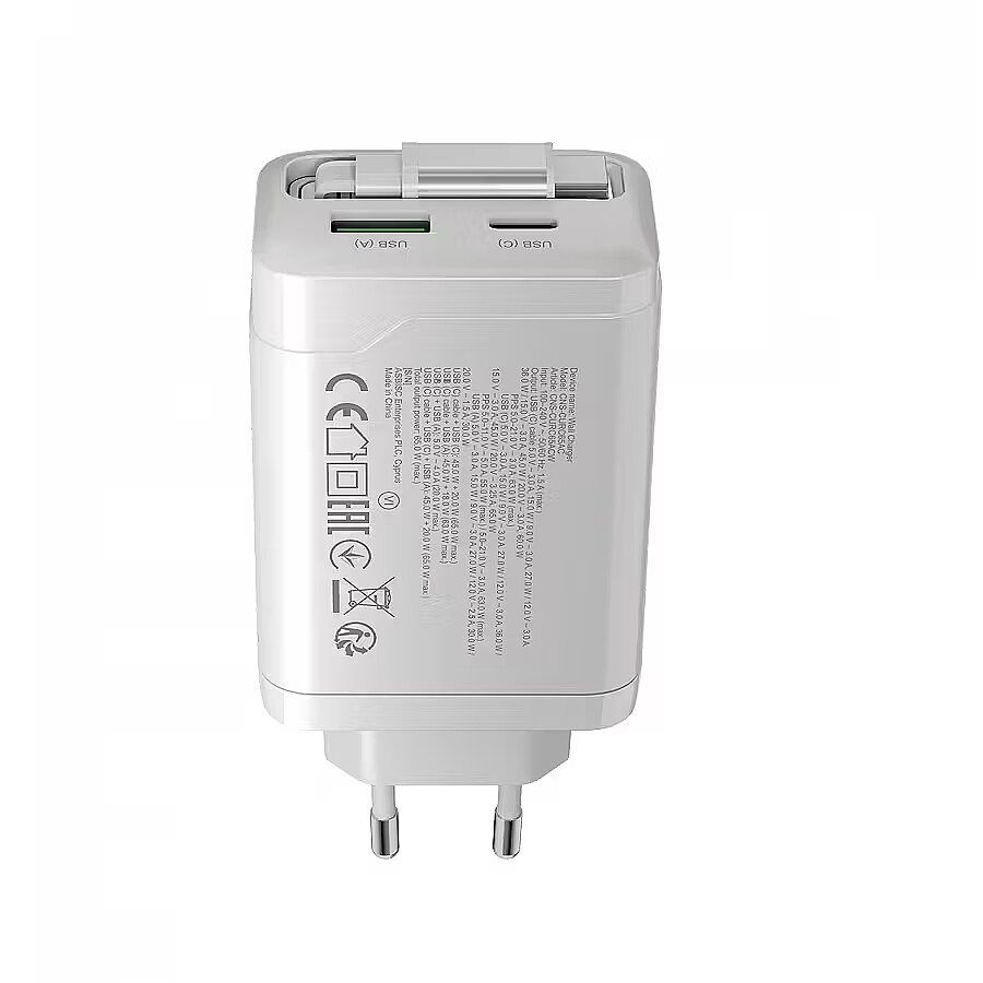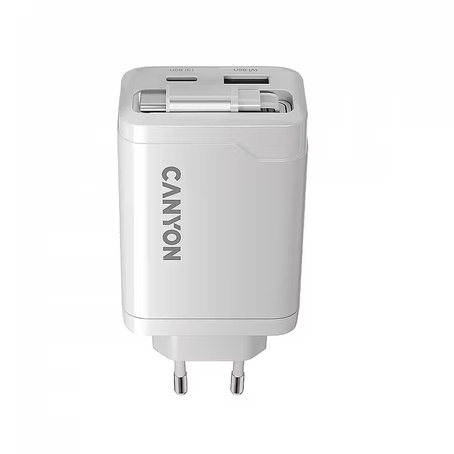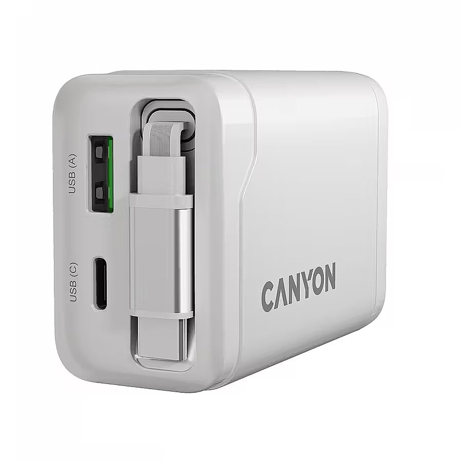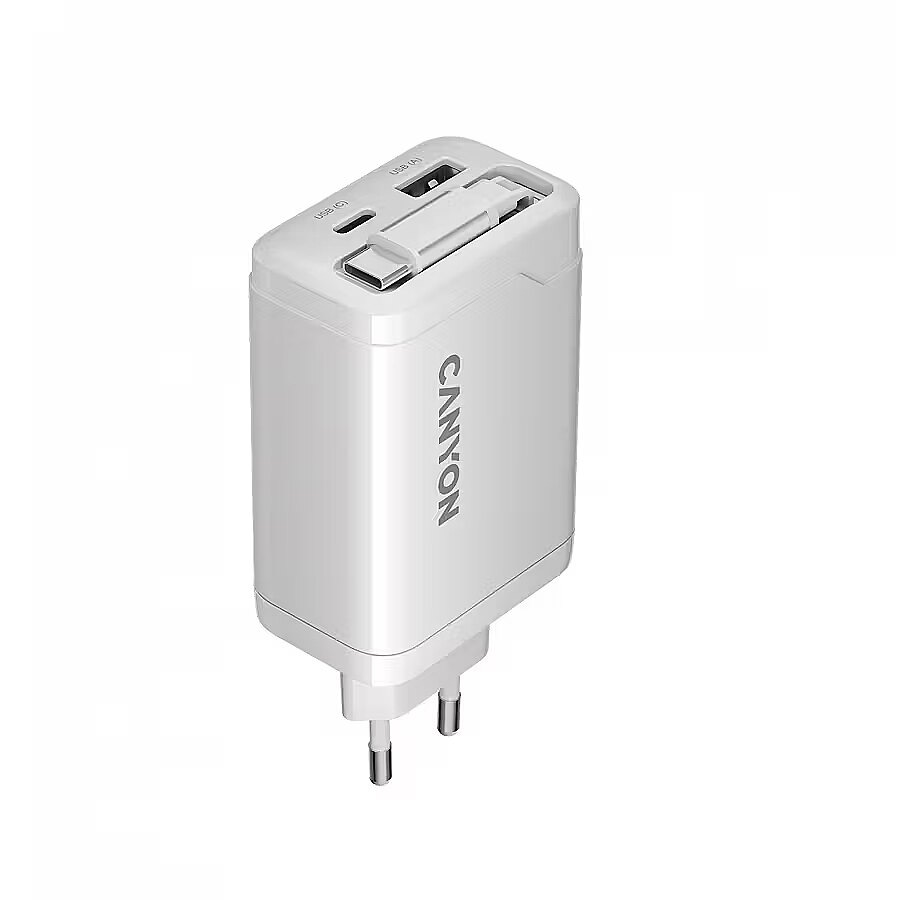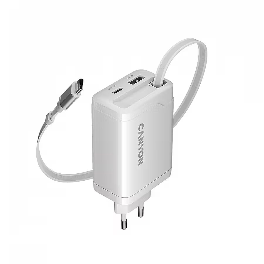 Produkta apraksts - CANYON lādētājs OnCharge 65RC Iebūvēts kabelis USB-C 65W 1xPD 1xQC EU White