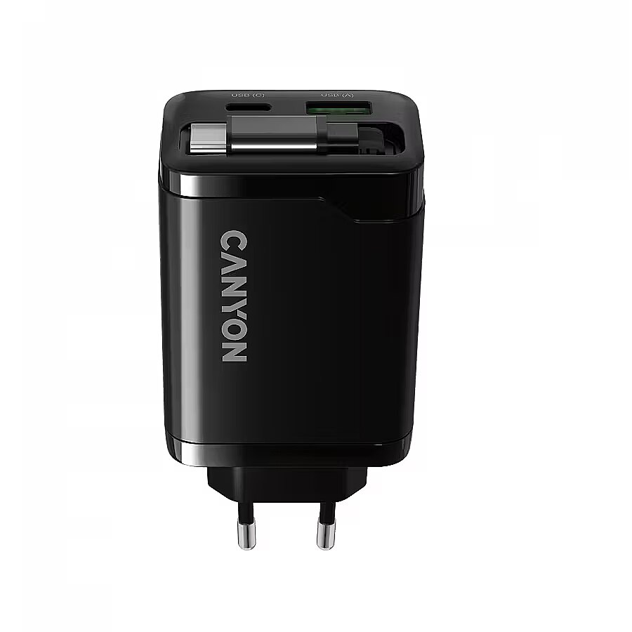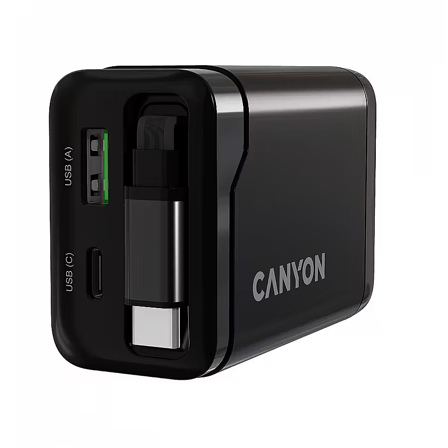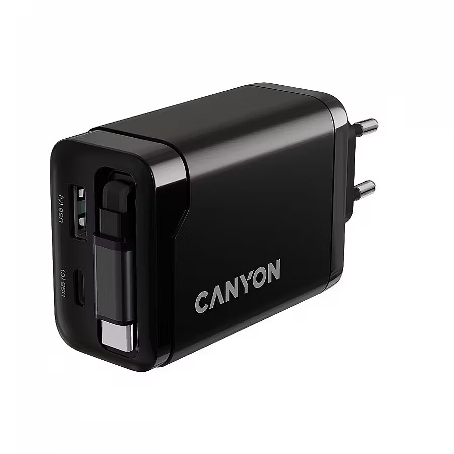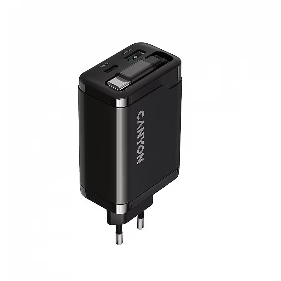 Produkta apraksts - CANYON lādētājs OnCharge 65RC Iebūvēts kabelis USB-C 65W 1xPD 1xQC EU Black