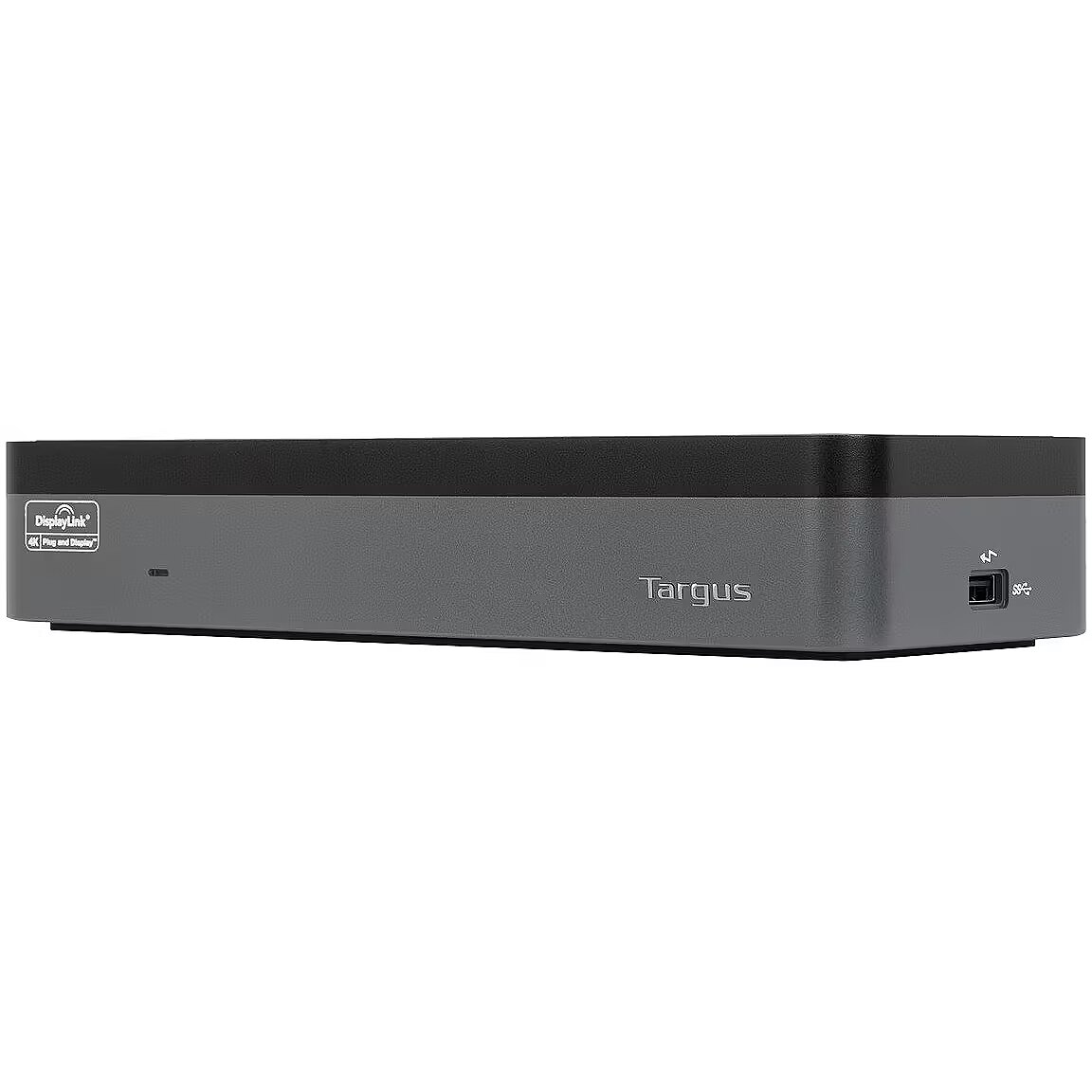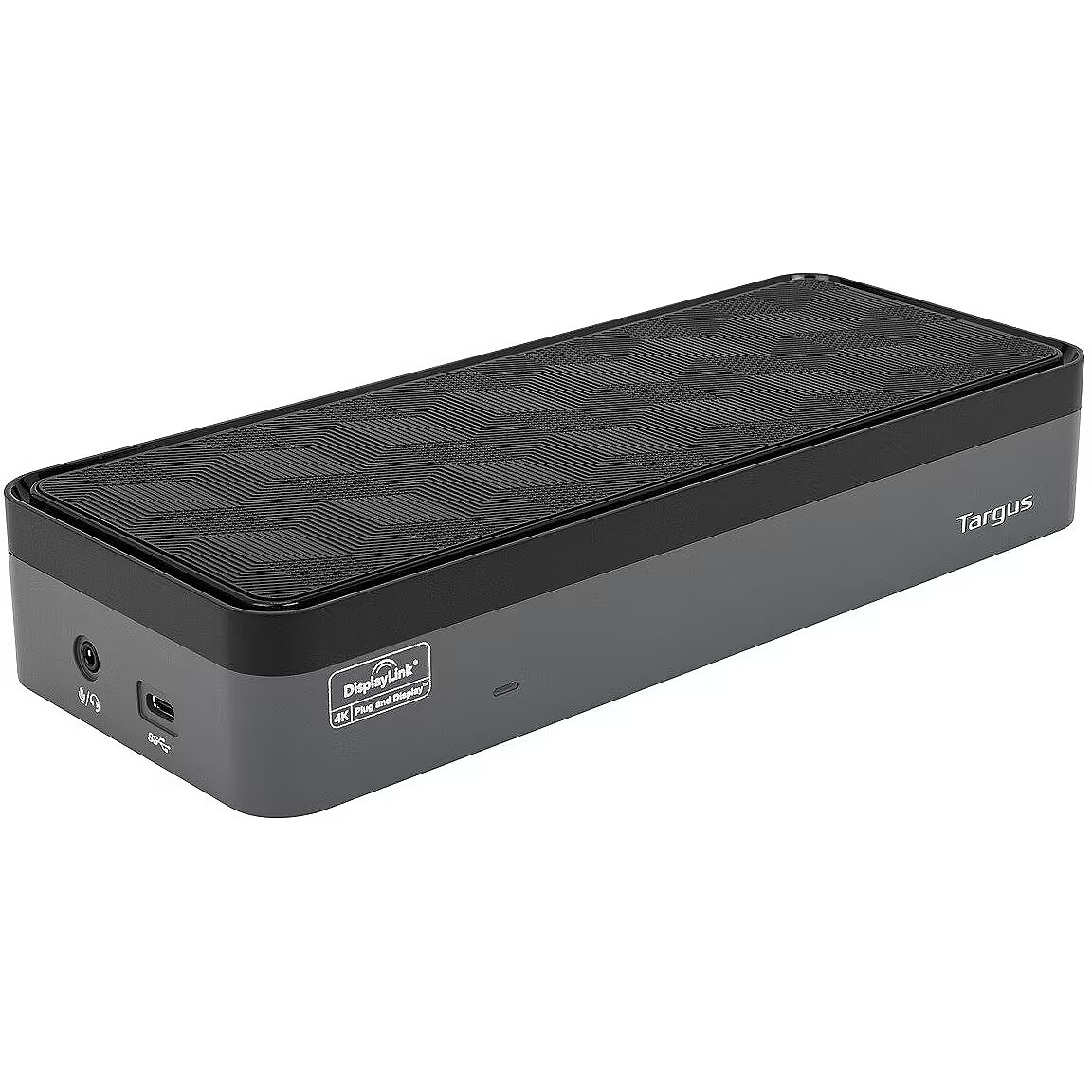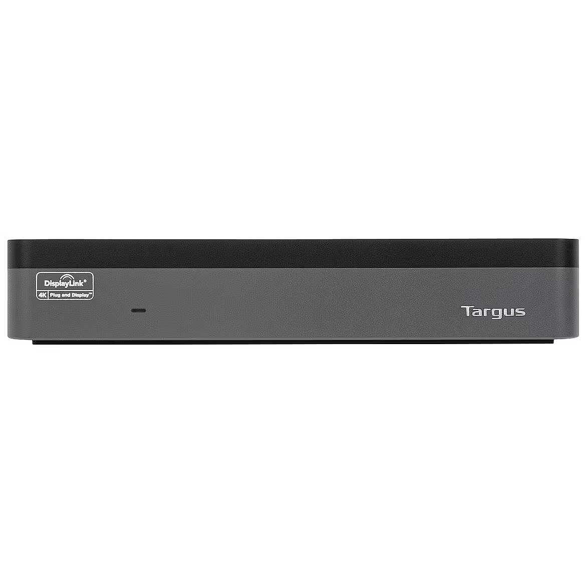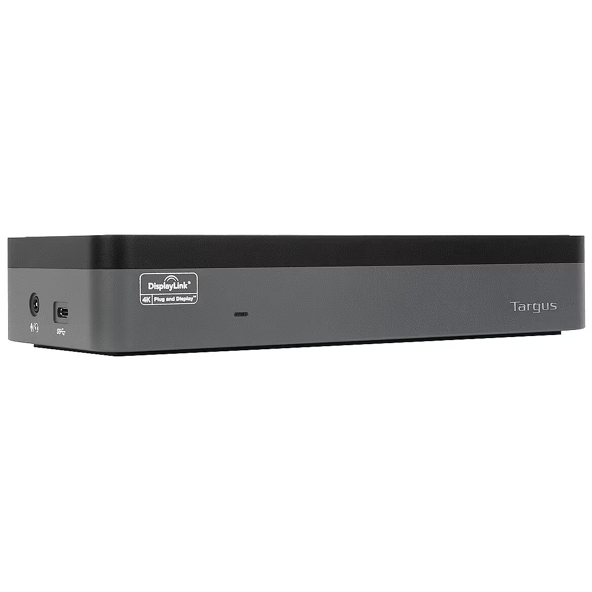LongDesc - Boost productivity and performance with the world’s first enterprise-class universal docking station to deliver four 4K extended displays. Ideal for large enterprises – the Targus USB-C™ Universal Quad 4K (QV4K) Docking Station maximises workstation viewing. Dual DisplayLink® DL-6910 chip technology supports up to four DisplayPort (3840 x 2160 p60) or HDMI (3840 x 2160 p50) displays. The docking station includes numerous additional ports to connect your essential USB 3.0 peripherals and Ethernet network.This sleek dock helps reduce clutter by providing the ease of a single connection for key peripherals like your mouse, keyboard and more. Its rubberised, padded bottom protects against scratches, while the VESA bracket mounting provision allows for use of the Targus VESA Mount Bracket (ACX003GLZ – sold separately) to hold your dock behind your display for even greater space savings. Your most advanced configurations become easy with compatibility across virtually any laptop and most standard peripherals including Thunderbolt 3™, Display Port Alt-Mode, and USB 3.0, 3.1 and Type-C devices. Charging tips and a USB-C to USB-A adapter included to make this dock compatible with a variety of major laptop brands.Supports DisplayPort and HDMI MonitorsYour workstation has never been more powerful with a high-performance quad-monitor dock that supports full 4K (3840 x 2160 p60) resolution or DisplayPort (3840 x 2160 p60) on all four displays as well as viewing modes for two and three monitors. The eight available video out ports allow you to decide between HDMI or DP++ display options to ensure compatibility for your configuration.Powering Your DevicesThe Universal USB-C™ Quad 4K Docking Station with 100W Power Delivery is the first quad-docking solution designed to keep your devices running no matter how long your day is. A simple front-panel blue light lets you know when power is connected, and a switch allows you to turn your power on or off in a snap. Offering 100W USB power delivery on PD 2.0, you can power laptops and larger devices through your dock, further reducing your clutter and making it easy to keep going all day. Onboard USB 3.0 for Advanced Peripherals and ChargingFour USB 3.0 ports make it easy to customise workspaces with the latest keyboards, external drives and other essential peripherals. Efficient charging is close at hand with one powered USB 3.0 port for keeping smartphone, tablet or other devices powered up and ready to go.