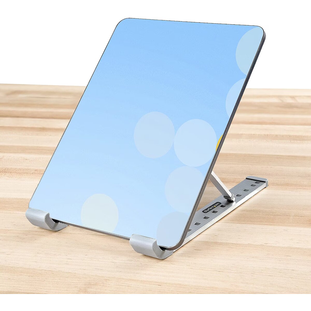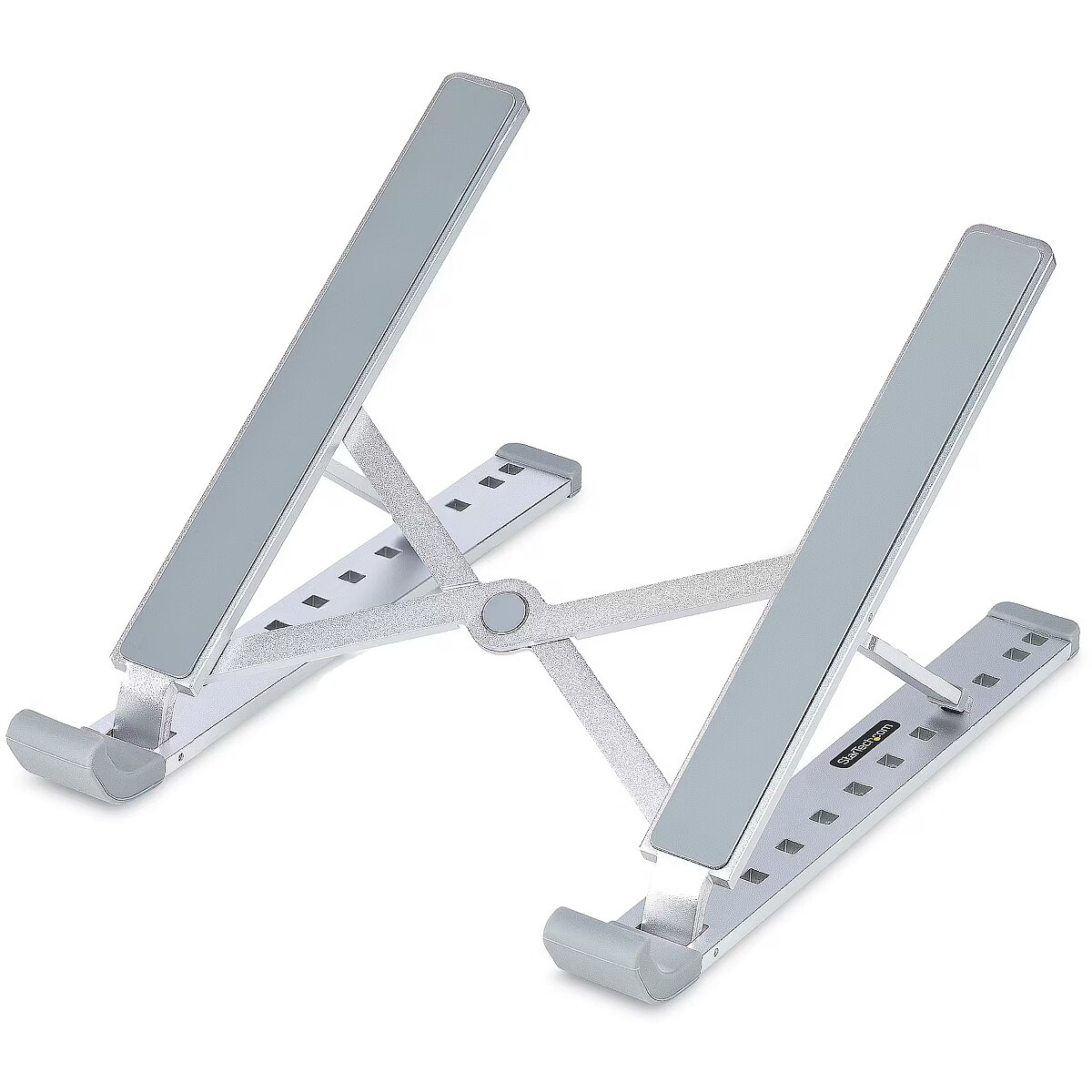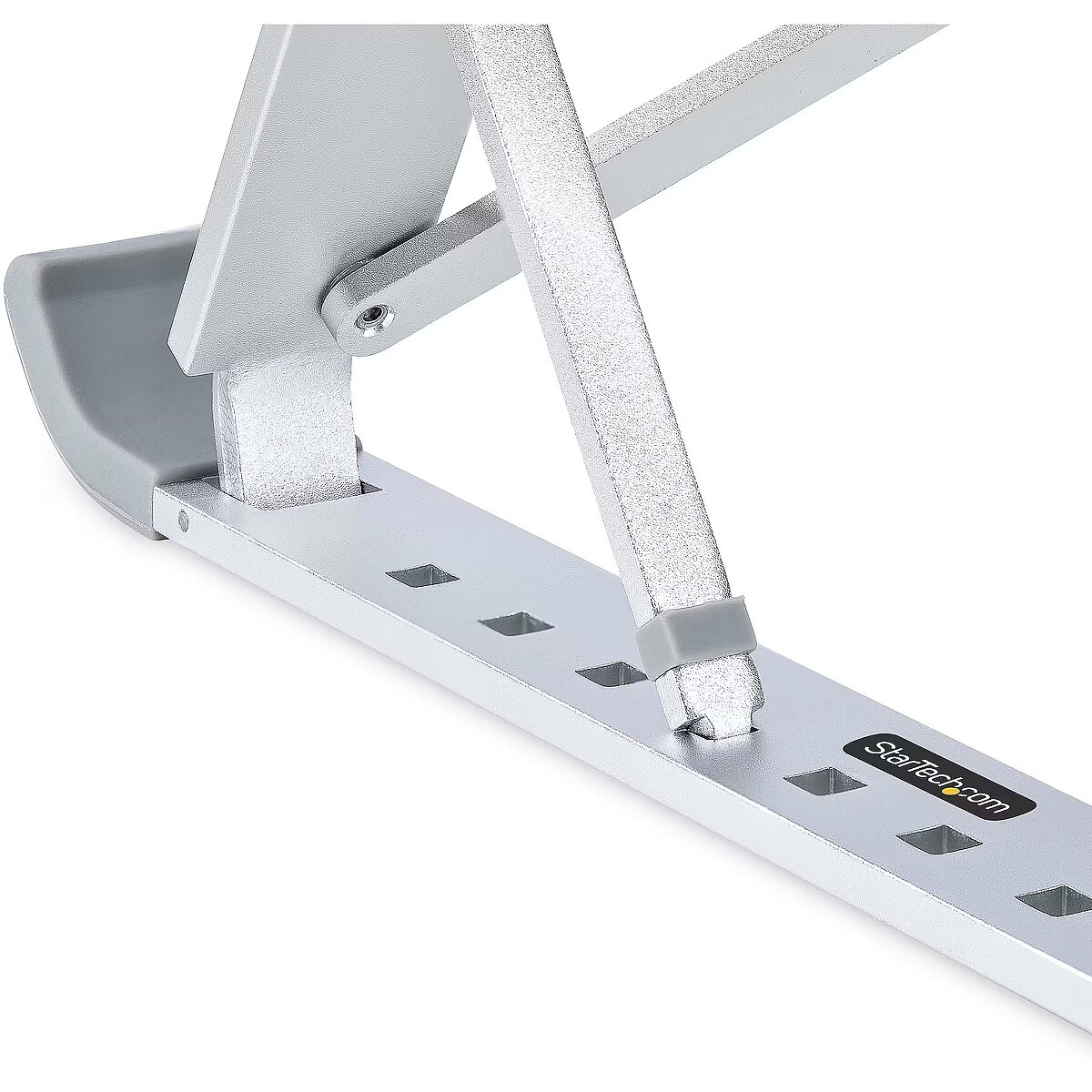 ShortSummaryDescription - StarTech.com Foldable Laptop Riser Stand, Portable Height Adjustable Ergonomic Laptop Stand, Ventilated Aluminum Frame Supports 22lb (10Kg), Tilt/Raised/Angled Laptop/Tablet Stand, Collapsible Design, Laptop stand, Silver, Aluminium, 10 kg, 15 - 84°, 341 g