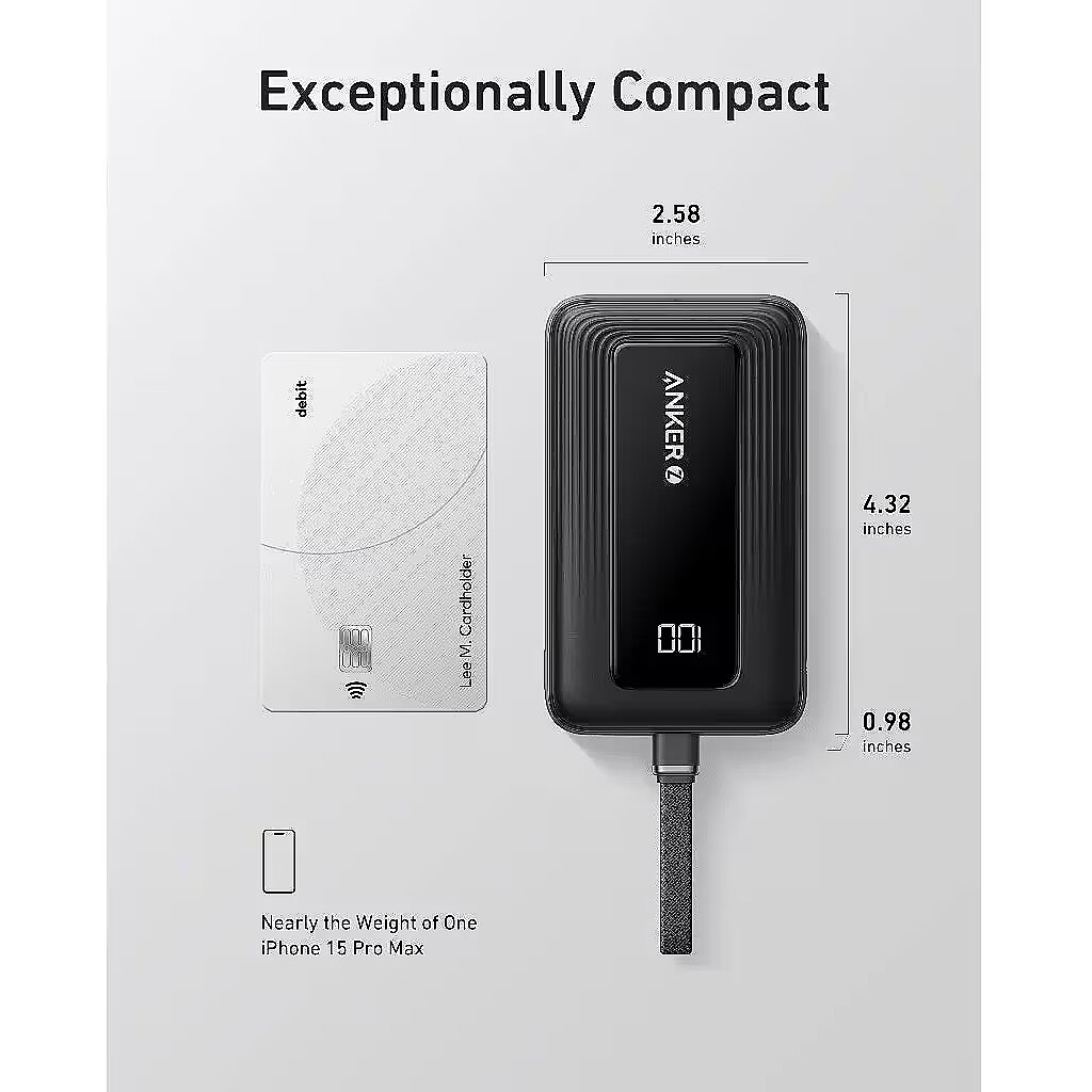 LongDesc - - Speedy 30W Charging: Experience the cutting-edge speed of 30W fast charging technology that propels your iPhone 15 from 0 to 57% battery in just 30 minutes.- Ready for Endless Use: Crafted for durability, the 5.4-inch built-in USB-C cable is tested to endure over 10,000 bends, ensuring it stands up to the rigors of everyday use.- Mighty Compact Power: This compact and powerful 10,000mAh power bank provides up to 2 full charges for an iPhone 15 and 1.94 charges for a Samsung S24, making it ideal for travel.- 30W Bi-Directional Charging: With two-way fast USB-C charging, enjoy up to 30W output and 20W input, ensuring your gadgets are quickly powered. (Note: Compatible with iPhone 16/15 Series, MacBook, Galaxy, iPad, Switch, Steam Deck, and more.)- What You Get: Anker Zolo Power Bank (10K, 30W) with a 5.4-inch (13.7 cm) built-in USB-C cable.