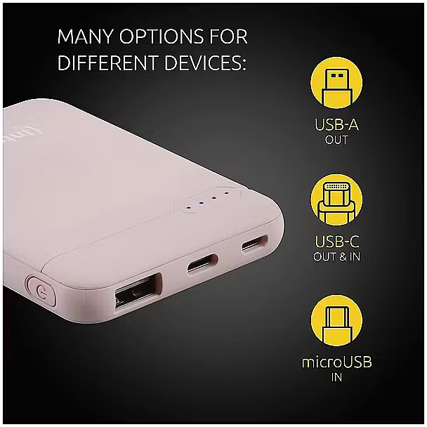 Technical_details - Type: power bank Color: pink EAN: 4034303028313 Manufacturer No.: 7313523 Operation: button to display the battery status Connections: 1x USB-A, 1x micro-USB socket, 1x USB-C Input Voltage: 5V Output voltage (fixed): 5 V Battery: 5,000mAh Suitable devices: mobile phone, MP3 player, tablet Power source: internal battery Security: OCP - Overcharge Protection, ODP - Deep Discharge Protection, OVP - Over Voltage Protection, SCP - Short Circuit Protection Dimensions: Width: 90mm x Depth/Length: 63mm Weight: 103 grams