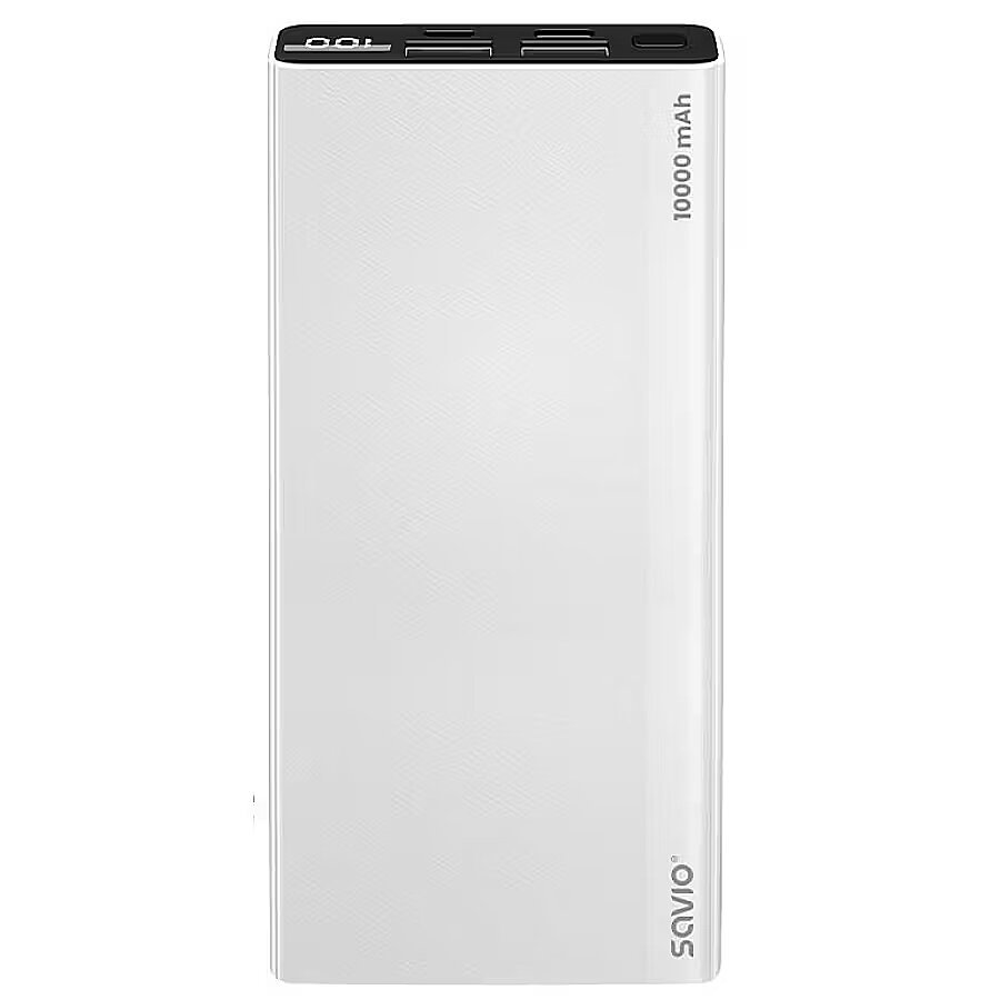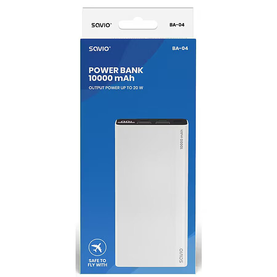 LargeDescHTML - SAVIO BA-04 Power bank The BA-04 power bank is a functional accessory for charging portable devices such as smartphones, tablets, and smartwatches. Its compact size and design make it easy to carry and practically use during trips. The product features a big 10000mA battery. It allows you to charge your devices multiple times, extending their usage – up to several hours. The lithium-polymer battery is protected by a durable case. The design is perfect for travel – you can take it on a plane without any problem. The elegant design grabs your attention and fits perfectly surrounded by modern devices. The BA-04 has been additionally covered with an anti-slip surface to improve comfort and safety at work. The power bank is equipped with USB-C and 2x USB-A output ports. You can charge up to 3 devices simultaneously. You can control the power level with the easy-to-read LED display, which shows the percent charge level. In addition, if you are using the Quick Charge option, the display will notify you with a special icon. The model uses the modern Quick Charge and Power Delivery standards. They guarantee a fast charging process for any connected device. If your devices support these standards, you can enjoy the optimum level of voltage and current between the power bank and the charged device. The charging process will not only be shorter but also safer. The BA-04 power bank has many solutions that guarantee safe use. The case is resistant to scratches and hits. The case protects the batteries inside. High-quality materials and components have passed several safety tests. The comprehensive protection covers both the power bank and the device charged. The BA-04 has built-in protection against:overchargingover-dischargeoverheatingoverloadshort circuit
